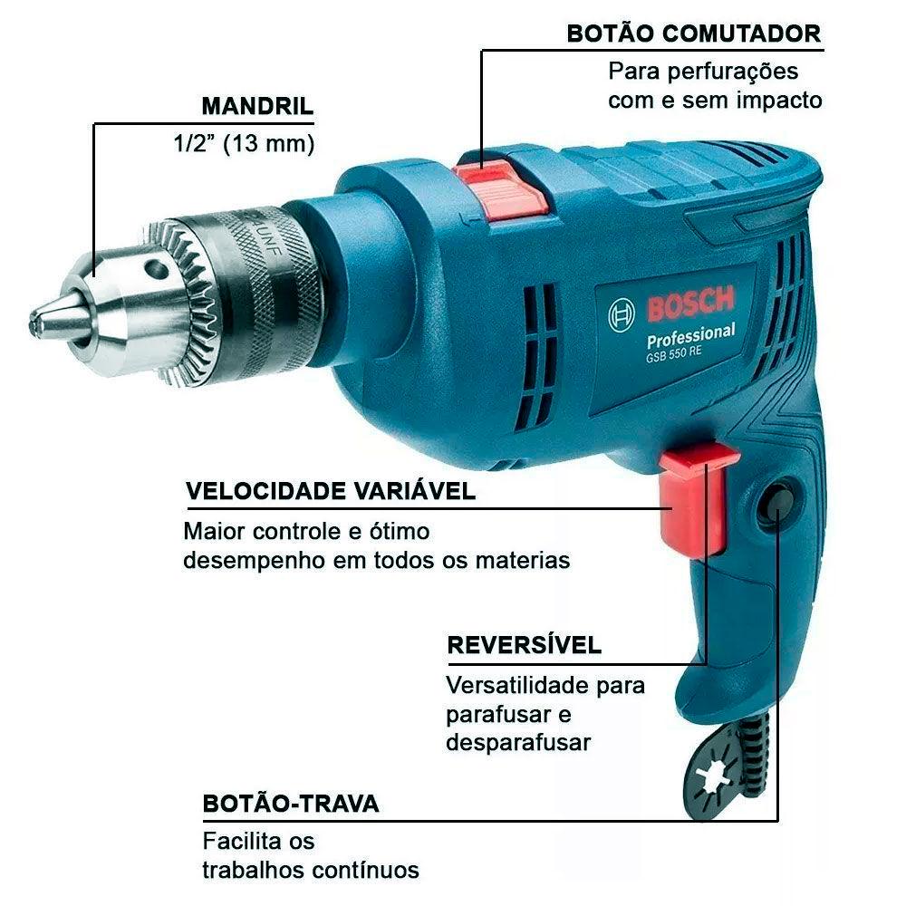 Furadeira de Impacto 1/2 POL 550W GSB550 RE com Reversão e Kit 14 Brocas BOSCHFuradeira de Impacto 1/2" 550W modelo GSB550 da marca Bosch desenvolvida para furação com impacto e furação simples, conforme o material a ser trabalhado.Sendo potente e extremamente compacta, de gama média, oferecendo uma maior produtividade e gerando menos fadiga, até mesmo em trabalhos sobre a linha da cabeça.A furadeira possui empunhadura emborrachada com agarre seguro e confortável., além de ser uma ferramenta de longa vida útil.Possui a função de velocidade variável e reversível.Acompanha um kit de 14 brocas em conjunto com a furadeira.DADOS TÉCNICOS:Modelo: GSB 550 REVoltagem: 127V ou 220V (não é bivolt)Potência: 550 WPeso: 1,3 KgNº de rotações em vazio: 3.100 r.p.m.Número máx. de impactos: 0 – 49.600 i.p.m.CAPACIDADES:Madeira: 25 mmAlvenaria: 13 mmMetal: 10 mmMadril 1/2 POL - 13 mmACOMPANHA:1 Furadeira 550W GSB 550 RE Bosch14 Brocas1 Chave de apertoCódigoS do fornecedor: 06011B60D4000 (127v) / 06011B60E4000 (220V)Garantia: 12 meses* Imagens meramente ilustrativas. Não acompanha empunhadeira.