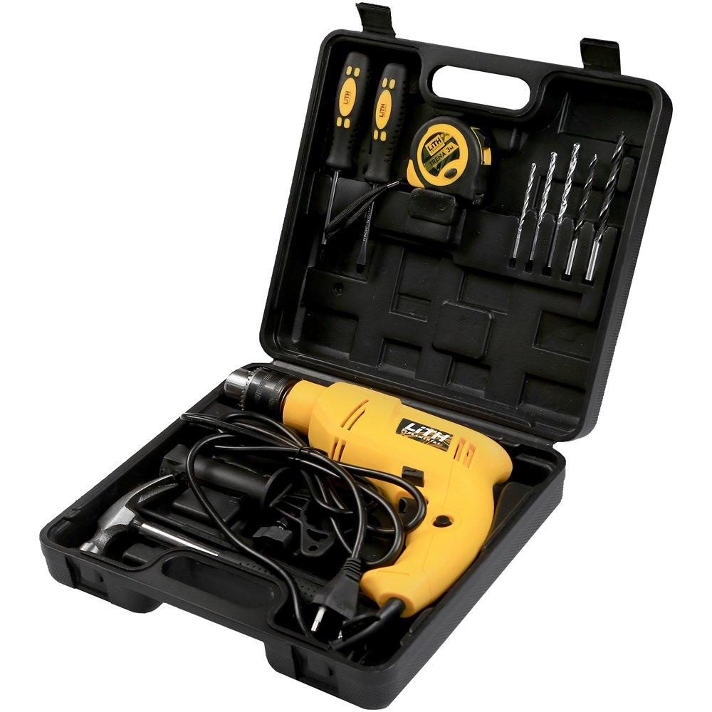 A Furadeira de Impacto desenvolvida pela LITH FERRAMENTAS, com mais de 700 Watts de potência e com controle de velocidade variáveis, projetada para as diversas situações de trabalhos. Pequena, compacta, mas com grande potencial operacional. Equipada com botão de trava do gatilho para evitar fadiga do operador, a ferramenta possui botão de reversão de rotação que faz da Furadeira eficiente em casos de retirada e travamento da broca na peça trabalhada. O mandril em metal que acomoda brocas de até 13 milímetros para alvenaria, madeira ou metal. A empunhadura auxiliar com suporte para limitador de profundidade pode ser facilmente removida conforme necessidade do operador. Este Jogo de furadeira mais ferramentas e acessórios com maleta se torna fundamental entre as ferramentas de maior utilidade em situações de emergência. - Especificações Técnicas: :: Código: LT7002X220S1 :: Tensão: 220V :: Frequência: 60 Hz :: Potência: 720W :: Velocidade: 0-3000 rpm :: Mandril: 1/2" (13mm) :: Capacidade de Perfuração: - Madeira: 25mm - Metal: 10mm - Alvenaria: 13mm :: Peso: 1.55kg - Conteúdo da Embalagem: :: Furadeira de Impacto :: Empunhadura Auxiliar :: Limitador de Perfuração :: Chave de Mandril :: Martelo Unha :: Trena 3 metros :: Chave de Fenda 75mm :: Chave de Fenda Cruzada 75mm :: 2 Brocas para Madeira: 6, 8mm :: 3 Brocas para Alvenaria: 4, 5, 6mm :: Maleta de Acondicionamento - Garantia: 3 Meses - Código de Barras: 7908591704075 Ref.: LITH-LT7002XS1 Marca.: LITH