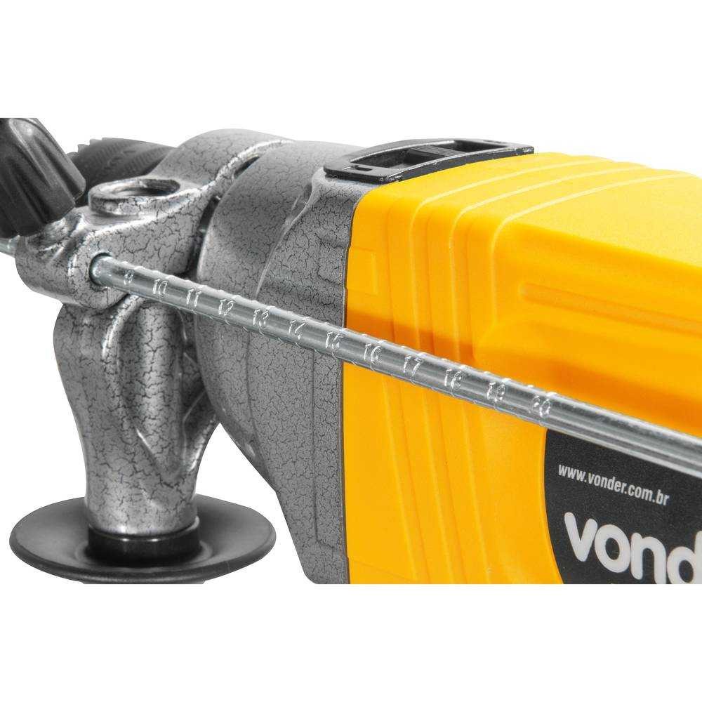 Indicada para metal e madeira na função sem impacto e na função com impacto para concreto e alvenaria. Deve ser utilizada com acessórios adequados. Possui interruptor eletrônico com pré-seleção de velocidade, que permite controlar a rotação da maquina possibilitando iniciar um furo com uma rotação baixa e aumentar gradativamente de acordo com a necessidade de perfuração. Possui ainda sistema reversível, que facilita a retirada da broca caso ela trave durante a perfuração. Conta com botão trava do interruptor para trabalhos contínuos, punho auxiliar e limitador de profundidade, conferindo maior praticidade. Conta ainda com cabo com revestimento emborrachado, proporcionando maior conforto ao operador, e motor com dupla isolação que proporciona mais segurança. ITENS INCLUSOS 1 Furadeira com impacto 1 chave para mandril 1 limitador de profundidade 1 punho auxiliar DETALHES TÉCNICOS Potencia (W): 1.050 Capacidade do mandril: 1/2 pol - 13 mm Tipo de velocidade: Variável Tipo de mandril: Com chave Rotação - velocidade 1(rpm): 0 - 3.000/min Rotação - velocidade 2(rpm): N/A Sistema de reversão: Reversível Capacidade máxima de perfuração em aço: 13,0 mm Capacidade máxima de perfuração em madeira: 30,0 mm Capacidade máxima de perfuração em concreto: 20,0 mm Impactos por minuto (ipm): 0 - 40.000/min Frequência: 50 Hz/60 Hz Nível de vibração (m/s2): 2,2 m/s2 Incerteza k (m/s2): 1,5 m/s2 Segue norma: ABNT NBR IEC 60745-1 e ABNT NBR IEC 60745-2-1 Massa aproximada: 3,3 kg