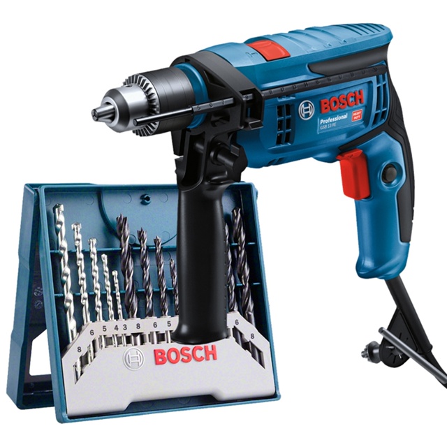 Furadeira de Impacto GSB 13 RE Bosch 750W + Jogo de Brocas Vantagens: - A furadeira de impacto Bosch GSB 13 RE possui 750W de potência, é super leve e compacta! Conta com menor vibração e menos ruído, além de uma carcaça reforçada de alta qualidade que aumenta a vida útil da ferramenta. Vem com empunhadura emborrachada para o agarre seguro e confortável, reduzindo a fadiga do usuário ao final do dia. Além disso, possui interruptor de velocidade variável e botão trava para trabalhos contínuos. - Uso com garantia de 2 anos Bosch. Características: - Equipamento Heavy Duty; - Tipo de embalagem: Caixa de papelão; - Comprimento do cabo: 2 m; - Acabamento do cabo: Borracha e cobre; - Acabamento da ferramenta: Poliamida, metal e elastômero; - Não possui controle de Torque; - Possui velocidade variável; - Possui Impacto; - Equipamento rolamentado; - Uso indicado: Perfurações em concreto, alvenaria, madeira e metal com e sem impacto; - Público Alvo: Pedreiros, marceneiros, carpinteiros, instaladores em geral, vidraceiros, oficinas de manutenção, serralheiros, eletricistas e calheiros. Dados Técnicos: - Tensão: 110 V ou 220 V (não é bivolt); - Potência da ferramenta: 750w; - Nº de rotações (sem carga): 0-3.800 rpm; - Torque Máx. (Duro): 1,8 Nm; - Tipo de mandril: com chave; - Mandril: 13 mm; - Impacto por minuto: 0-57.000; - Diâmetro max. perfuração madeira: 25 mm; - Diâmetro max, perfuração concreto broca maciça: 13 mm; - Diâmetro max. perfuração concreto: 13 mm; - Diâmetro max. perfuração aço: 10 mm; - Dimensões do produto (AxLxP): 19,2 x 7 x 27,2 cm; - Peso: 1,8 kg. Jogo Brocas Bosch Mini X-line 15 peças Vantagens: - Possui um completo portfólio de brocas com diferentes diâmetros que variam entre 3,0mm e 8,0mm, sendo as de aço rápido para aplicações em metal, brocas com ponta de metal duro para perfurações em alvenaria e brocas de três pontas para aplicações em diferentes tipos de madeira. Características: - Acabamento do acessório: Aço; - Número de peças: 15. Componentes incluídos na embalagem: - 1 Furadeira de Impacto GSB 13 RE; - 1 manual de instruções; - 1 Chave de mandril; - 1 Empunhadeira auxiliar; - 1 limitador de profundidade. - 5 Brocas para metal: 3 / 4 / 5 / 6 / 8mm; - 5 Brocas para concreto: 3 / 4 / 5 / 6 / 8mm; - 5 Brocas para madeira: 3 / 4 / 5 / 6 / 8mm. SKU (uso interno): 559602 ou 559603 SKU (uso interno): 552156