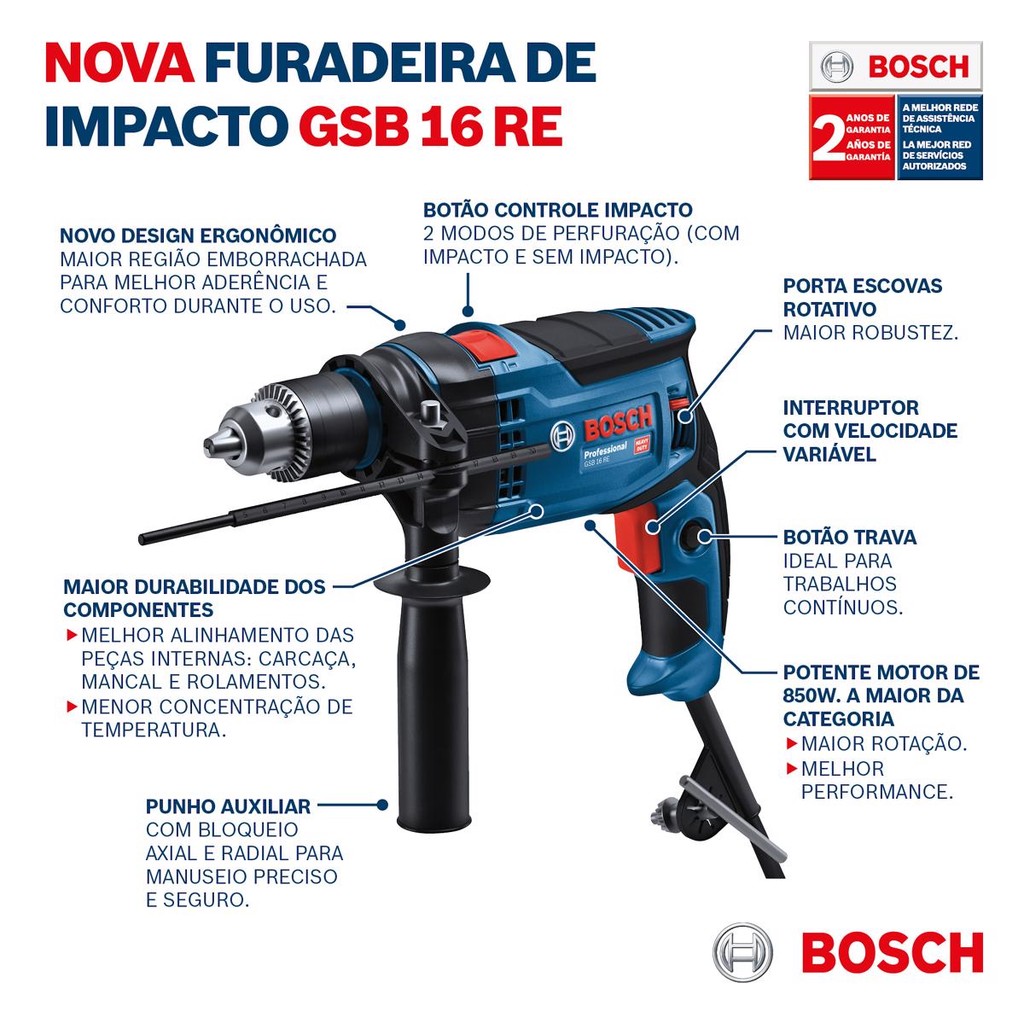A furadeira de impacto Bosch GSB 16 RE é indicada para os trabalhos mais exigentes. É a primeira furadeira da categoria com 850W de potência e rotação de 3.500 RPM, por isso, traz a combinação perfeita de robustez e desempenho. Versátil, conta com 2 modos de perfuração, com impacto e sem impacto. A carcaça reforçada, a engrenagem helicoidal, o porta-escovas e o botão de reversão de alta qualidade tornam a ferramenta muito mais durável com o benefício de oferecer menor vibração e ruído para o usuário. Além disso, o melhor alinhamento das peças internas contribui também para o aumento da vida útil. A furadeira de impacto também vem com pega emborrachada para melhor aderência e conforto durante o uso. Vem com interruptor de velocidade variável, punho auxiliar e radial para um manuseio seguro, além de botão trava para trabalhos contínuos. A furadeira de impacto Bosch GSB 16 RE acompanha: chave de mandril, empunhadeira auxiliar, limitador de profundidade e manual. Garantia 2 anos Bosch.Marca: BoschPotência da ferramenta (W): 850Velocidade variável? SimControle de Torque? NãoRolamento ou Bucha? RolamentoTorque Máx. (Nm)(Duro): 2,1Nº de rotações (sem carga) rpmMínimo e Máximo: 0 - 3.500Diâmetro max. perfuração concreto (mm): 16Diâmetro max, perfuração concreto broca maciça (mm): 16Diâmetro max. perfuração madeira (mm): 30Diâmetro max. perfuração aço (mm): 13Mandril (polegadas)Mandril (mm): 1/2"Tipo de Mandril / Sistema de encaixe: Com chavePossui Impacto? SimImpacto (ipm = impacto por minuto): 0-52.500Vibração (m/s²): Furar em metal: ah = 7,5 m/s², K = 1,5 m/s², Furar com Impacto em concreto: ah = 18,0 m/s², K = 1,5 m/s²Ruído: nível de pressão sonora 95 dB(A); nível de potência sonora 106 dB(A). Incerteza K = 3 dBTipo de embalagem: Caixa de papelãoAcompanha maleta? NãoFonte de Energia: CaboComprimento do cabo (m): 2Cor: AzulPerfurações em concreto, alvenaria, madeira e metal com e sem impacto1 Furadeira de Impacto GSB 16 RE, 1 manual de instruções, 1 Chave de mandril, 1 Empunhadeira auxiliar, 1 limitador de profundidade