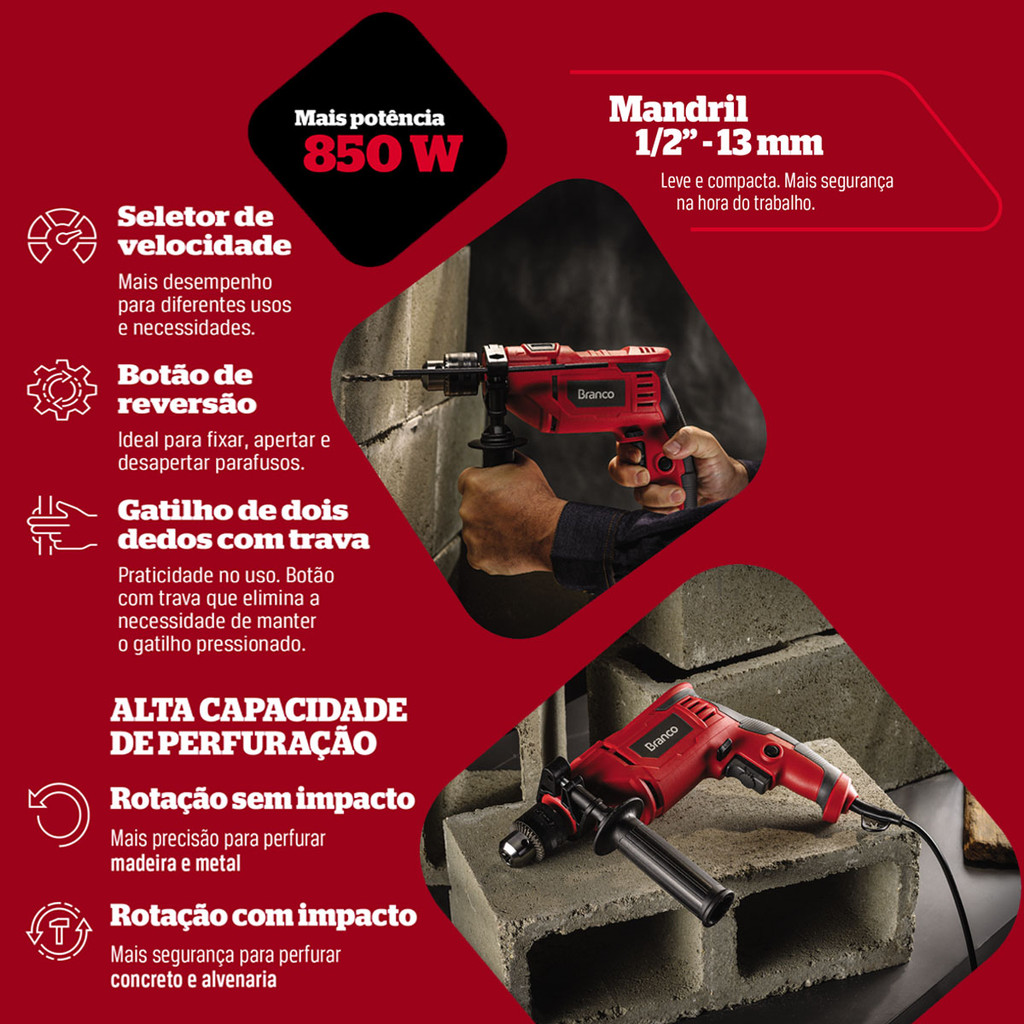 Furadeira de Impacto Reversível 850W 13mm BF1850 Branco Para Madeira Metal
