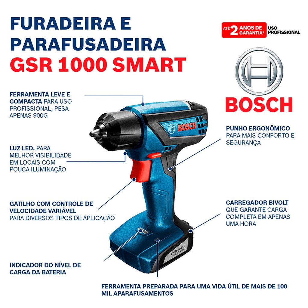 Distribuído por Ismafer Ferramentas PARAFUSADEIRA FURADEIRA A BATERIA 12V 6MM COM CARREGADOR, MALETA E KIT - GSR 1000 SMART A parafusadeira e furadeira GSR 1000 Smart é a mais compacta da categoria, ideal para transportar no dia a dia e trazer mais praticidade. Oferece mais conveniência no trabalho por ter carregador rápido bivolt que carrega a ferramenta em até 1 hora. A parafusadeira e furadeira GSR 1000 Smart possui fácil controle de velocidade, luz de led que ilumina ambientes mais escuros e indicador eficiente de nível de bateria. Além disso, vem com punho emborrachado e ergonômico que reduz a fadiga do operador ao final do dia. A Parafusadeira e Furadeira a Bateria Bosch GSR 1000 Smart, 12V, com Bateria de 1.5Ah embutida e carregador BIVOLT, tem autonomia com até 600 parafusamentos por carga de bateria. Além disso, é a ferramenta a bateria de 12v potente e com 15Nm de torque, e vem ainda com interruptor de velocidade variável para melhor controle e qualidade dos seus trabalhos. O seu mandril de aperto rápido possibilita mais praticidade e rapidez na troca dos acessórios. FICHA TÉCNICA: - Com Luz LED: Sim - Voltagem da Bateria: 12V - Amperagem da Bateria: 1.5Ah - Com Velocidade variável: Sim - Velocidade de Rotação: 700rpm - Tipo de bateria: Íons de lítio - Torque (suave/duro/máx.): 6/15/- Nm - Com indicador de Carga da Bateria: Sim - Amplitude de aperto(min./máx.): 0,8 / 6mm. ACOMPANHA: 01 - Carregador Bivolt 01 - Adaptador Magnético 01 - Maleta de Transporte 10 - Bits Fenda, Phillips, Torx. Marca: Bosch Modelo: GSR 1000 SMART COM MALETA E KIT Garantia: Até 2 Anos de Garantia (Fabricante) + CONJUNTO DE PONTAS E BROCAS BOSCH V-LINE 68 PEÇAS COM MALETA O Conjunto de Pontas e Brocas Bosch V-Line 68 Peças é a solução ideal para quem busca versatilidade, praticidade e desempenho profissional em um único kit. Projetado pela renomada Bosch, líder mundial em tecnologia e ferramentas, o conjunto reúne brocas e pontas de alta precisão, ideais para trabalhos em madeira, metal e alvenaria. Fabricadas com materiais de alta resistência e durabilidade, as peças garantem perfurações limpas, fixações firmes e resultados consistentes mesmo sob uso intenso. A maleta organizadora proporciona excelente mobilidade e praticidade, mantendo cada item em seu devido lugar e facilitando o transporte e o acesso rápido durante o trabalho. Seja para profissionais da construção, marceneiros, eletricistas ou usuários domésticos exigentes, o V-Line 68 Peças oferece tudo o que você precisa para executar seus projetos com eficiência, precisão e segurança VANTAGENS: - Completo e versátil — atende diferentes tipos de materiais e aplicações. - Alta durabilidade — peças resistentes e de longa vida útil. - Maleta prática — organização e transporte facilitados. FICHA TÉCNICA: - Material: Metal - Aplicações: Madeira, metal e alvenaria - Comprimento: 22,5 cm - Largura: 32,1 cm - Altura: 7,1 cm - Peso aproximado: 1,6 kg (pode variar conforme o lote) - Tipo de maleta: Plástica rígida com alça e travas seguras CONTEÚDO DA EMBALAGEM: - 1 Barra magnética expansível - 1 Estilete - 1 Aparafusadora angular - 8 Brocas para metal (2 a 6 mm) - 9 Brocas para pedra/alvenaria (4 a 10 mm) - 8 Brocas para madeira (3 a 10 mm) - 2 Brocas chatas para madeira (16 e 20 mm) - 29 Pontas aparafusadoras (Phillips, Fenda, Torx e Hex) - 1 Suporte de pontas universal magnético - 6 Chaves de caixa - 1 Adaptador para chave de caixa - 1 Escareador - 1 Maleta plástica organizadora Marca: Bosch Modelo: V-Line 68 Peças Garantia do fabricante: 3 meses SKU: KIT23990_25012 Distribuído por Ismafer Ferramentas