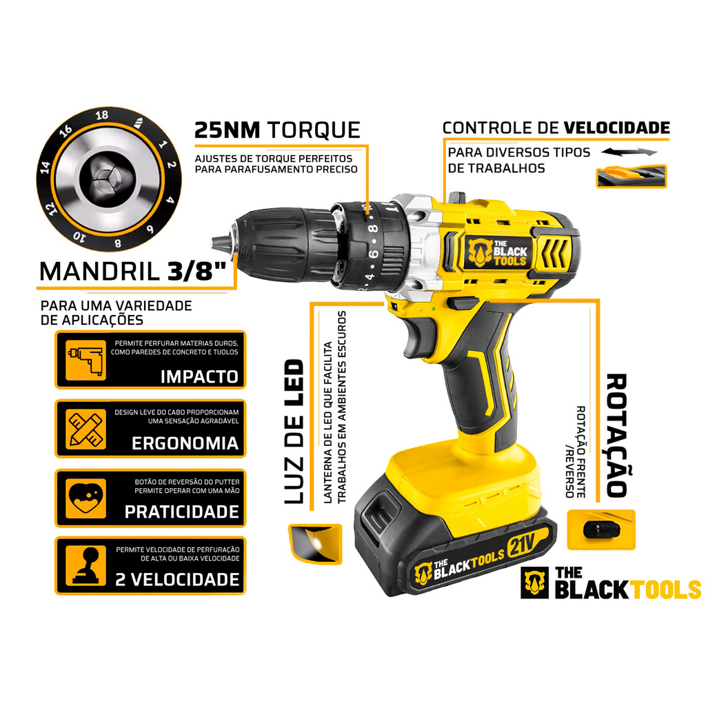 Furadeira E Parafusadeira Impacto 2 Baterias 2000mah 21v 3/8 Tb-21pkx C/ Acessórios The Black Tools