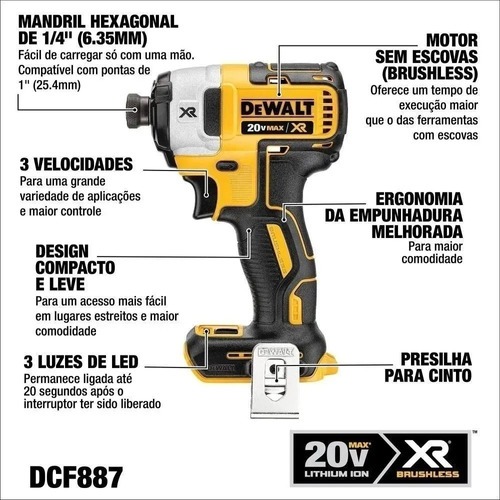 DISTRIBUÍDO POR C-JAÚ FERRAMENTAS Furadeira Parafusadeira A Bateria 20V DCD996 + Parafusadeira de Impacto DCF887 + 2 Baterias 20v Powerstack + Carregador Bivolt DCB107 + Bolsa Dewalt CARACTERÍSTICAS O motor sem escova de alta potência e alta eficiência da DEWALT oferece até mais 75% de tempo de execução vs. motores escovados NiCad 18vAs baterias XR Li-Ion com indicador de combustível fornecem 33% mais de capacidade em pacotes padrão Empilhador de metal com nitro-carburado de carga pesada de 1/2 “com insertos de carboneto para uma força de aperto de bits superiorO LED de 3 modos fornece iluminação em espaços escuros ou confinados até 20X mais brilhantes que o modelo anterior. O modo LED Spotlight possui uma função de desligamento de 20 minutos que permite um tempo de trabalho prolongado em espaços escuros ou confinados ESPECIFICAÇÕES TIPO DE BATERIA ÍON DE LÍTIO CHUCK SIZE 1/2 “CHUCK TIPO METAL RATCHETING CONFIGURAÇÕES DA EMBREAGEM 11KIT BOX NONE MAX POWER 820 UWO SEM VELOCIDADE DE CARGA 0-450 / 0-1,300 / 0-2,000 RPM # DE CONFIGURAÇÕES DE VELOCIDADE 3 TIPOS DE FERRAMENTA ELÉTRICA SEM FIO SISTEMA 20V MAX *UNIDADES WATTS OUT 820 ACOMPANHA: PARAFUSADEIRA DCD996B 20V DEWALT PARAFUSADEIRA DCF887B-B3 20V DEWALT CARREGADOR DE BATERIAS 12-20 VOLTS DCB107 BIVOLT DEWALT 2 BATERIAS 1,7AH POWERSTACK DEWALT BOLSA DEWALT