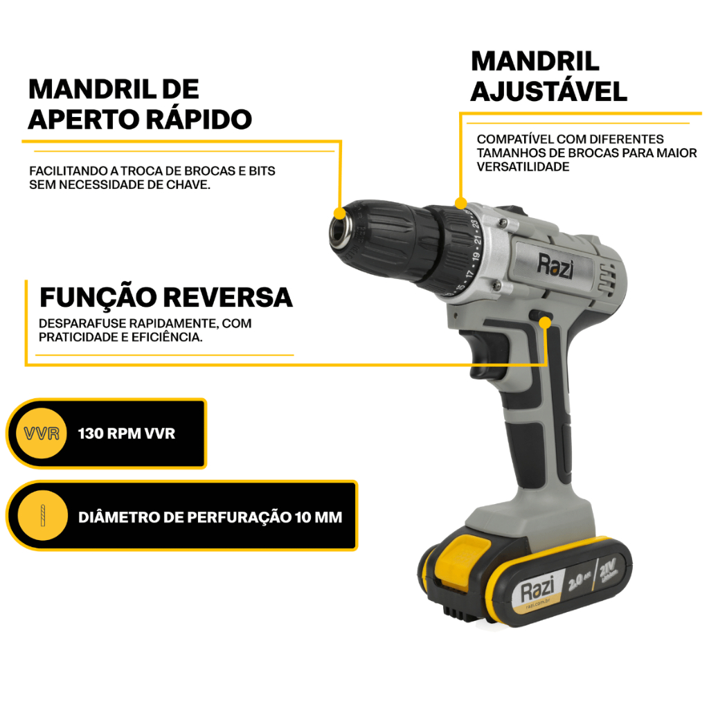 Furadeira Impacto e Parafusadeira 2 em 1 21V á Bateria RZ-FPB121 Bivolt Razi