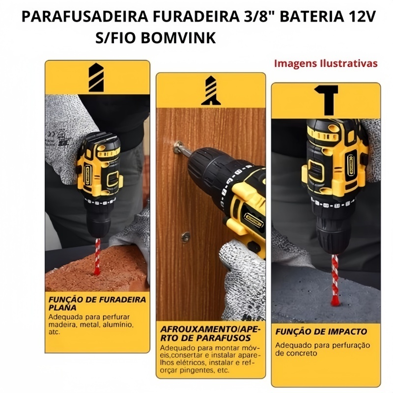 Furadeira elétrica de 12V com motor sem escova, oferecendo força de impacto de 1200 kPa para perfurações precisas e eficientes KIT COMPLETO: Inclui múltiplas pontas de parafusadeira e brocas variadas, adequadas para diferentes tipos de parafusos e materiais BATERIA DE LÍTIO: Sistema de bateria recarregável de lítio que proporciona maior autonomia e desempenho consistente durante o uso VERSATILIDADE: Ideal para trabalhos em madeira, metal e outros materiais, com ajuste de velocidade e torque para diferentes aplicações DESIGN ERGONÔMICO: Estrutura compacta com empunhadura emborrachada para maior conforto e controle durante o uso prolongado