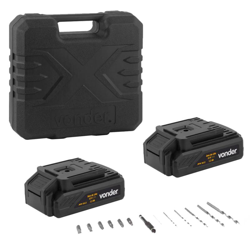 Furadeira Parafusadeira 12V BIVOLT PFV 012 c/ 2 Baterias e Kit de Brocas e Bits VONDERCOMPOSIÇÃO DO COMBO:1 Furadeira e Parafusadeira à Bateria 12V BIVOLT PFV 012 VONDERAcompanha: 1 maleta, 1 bateria de 12 V, 1 carregador bivolt automático, 6 brocas para madeira (1,5 mm, 2,5 mm, 3,0 mm, 4,0 mm, 5,0 mm e 6,0 mm), 6 bits (2 fendas (5 mm e 6 mm), 2 phillips (PH1 e PH2) e 2 pozidrive (PZ1 e PZ2)) e 1 soquete magnético encaixe de 1/4"Indicada para soltar e apertar parafusos de até 6 mm de diâmetro e fazer furos em madeiras ou metais. Tempo de carregamento da bateria: 3 a 5 horas.Possui regulagem para 18 posições de torque e 1 posição para perfuração, LED para melhor visibilidade do local de trabalho, cabo com revestimento emborrachado, proporcionando maior conforto ao operador, bateria de íons de lítio que confere alta eficiência de operação, indicador de carga da bateria, além de carregador bivolt automático com tensão de entrada de 100 V~ - 240 V~DETALHES TÉCNICOS:Tensão da bateria: 12,0 VTipo de bateria: Bateria de íons de lítioCapacidade do mandril: 3/8" - 10 mmTipo de mandril: Aperto rápidoTorque máximo/ força de aperto: 23 N.m (2,3 kgf.m)Capacidade máxima de perfuração em aço: 10,0 mmCapacidade máxima de perfuração em madeira: 16,0 mmCapacidade de furação no concreto: N/ATipo de velocidade: VariávelRotação da Furadeira/parafusadeira: 0 - 650 rpmSistema de reversão: ReversívelImpactos por minuto (ipm): N/ATensão do carregador de bateria: 100 V~ - 240 V~ - Bivolt automáticoFrequência (Hz): 50 Hz/60 HzSegue norma: ABNT NBR IEC 60745-1, ABNT NBR IEC 60745-2-1 e ABNT NBR IEC 60745-2-2Massa aproximada: 1,09 kgGarantia - E (CDC):Garantia legal: 90 dias + Garantia contratual: 9 mesesReferência: 60.01.012.000+ 1 Bateria 12V Lítio para Parafusadeira Furadeira PFV 012 VONDER1 BateriaIndicada para a parafusadeira/furadeira PFV 012, PFV 012I, PFV 112QR e PFV 074 VONDERBateria de íons de lítio, garantindo alta eficiência de operaçãoDETALHES TÉCNICOS:Tensão (V):12,0VTipo de bateria: Bateria de íons de lítioCapacidade da bateria (A): 1,3 AhGarantia (CDC): Garantia legal: 90 diasCódigo de Fábrica: 93.06.012.038* Imagens meramente ilustrativas.