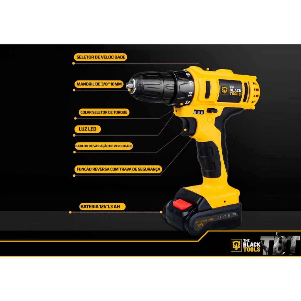 A The Black Tools é uma marca comprometida com a qualidade e as necessidades do cliente. Nosso objetivo é oferecer as melhores soluções para o seu dia a dia, com um design funcional e inovador. PARAFUSADEIRA E FURADEIRA 12V LÍTIO TB-12E - THE BLACK TOOLS Para quem busca praticidade e efetividade nas diversas tarefas manuais, a parafusadeira e furadeira TB12E 12V The Black Tools é a solução. Com design único e exclusivo The Black Tools, uma ferramenta compacta, robusta, ideal para você. Vem com mandril de aperto rápido e design ergonômico, que garante maior conforto ao utilizar. VANTAGENS: - Bivolt, opera com bateria recarregável de tecnologia lítio (Li-on), o que traz maior vida til ao produto e proporciona ter a ferramenta sempre a mão. - Somado o ajuste de velocidade, a ferramenta oferece mais produtividade e economia de tempo - Tem led indicativo de nível da bateria, que sinaliza o momento de recarregar. - O LED embutido ajuda a clarear e ter visibilidade do local de trabalho. INDICAÇÃO: - Seja para apertar ou soltar parafusos, você tem o controle através do seletor de reverso, que inverte o sentido de rotação para o uso adequado a cada necessidade. - Com seletor de torque de 18 níveis para parafusar e 1 nível para perfurar, é possível ajustar para os mais adequados tipos de trabalhos a serem realizados. - Pode ser usada para materiais como: tijolos, concretos, pedras, madeiras, cerâmicas, metais entre outros. ITENS INCLUSOS: - 01 Furadeira E Parafusadeira. - 01 Conector para bits. - 10 Bits de parafuso. - 01 Carregador. - 01 Bateria. - 04 Brocas. - 01 Maleta. - 01 Manual. CARACTERÍSTICAS: - Torque máximo (N*M): 14 (junta flexível)/28 (junta rígida). - Torque Max 14 N.M junta flexível / 28 N.M junta rígida. - Capacidade da Broca (mm): Φ10(Aço)/Φ25(Madeira). - Diâmetro do mandril 3/8” 10mm (aperto rápido ). - Rotação: 0-350/0-1350 RPM:: Baterias 1300 mah. - Velocidade variável e reversível. - Indicador de carga de bateria. - 25 + 1 opção de torque. - Empunhadura Soft Grip. - LED para iluminação. - Voltagem Bivolt. Marca: The Black Tools Modelo: TB12E Peso: 1.88 Kg Dimensões (CxLxA): 16,5 x 4.5 x 19.5 cm Garantia: 06 Meses + KIT CHAVES JOGO CATACRA REVERSÍVEL SOQUETES 40 PEÇAS COM MALETA O Kit Jogo Soquete Fertak C/catraca 40 peças é uma ferramenta essencial para quem busca praticidade e eficiência em reparos e manutenções. Composto por 40 peças, incluindo soquetes de diversos tamanhos e uma catraca, é ideal para trabalhos em mecânica, elétrica e hidráulica. FICHA TÉCNICA: - Uso Doméstico (Hobby). - Aco Carbono. ACOMPANHA: - 14 soquetes 1/4" : (5/32), (3/16), (7/32), (1/4), (9/32) (5/16), (11/32), (3/8), (13/32), (7/16) (15/32), (1/2), (17/32), (9/16). - 14 soquetes 1/4" : 4 / 4.5 / 5 / 5.5 / 6 / 6.5 / 7 / 7.5 /8 / 9 / 10 / 11 / 12 / 13 mm. - 03 soquetes 1/4" : (1/4), (5/16), (3/8). - 02 soquetes 3/8" : (5/8), (11/16). - 02 soquetes 3/8" : 14 / 15mm. - 01 adaptador : 1/4" - 3/8. - 01 chave Catraca : 3/8". - 01 extensao 3/8" : 3". - 01 Estojo organizador. - 01 Disco. Marca: FERTAK Modelo: 40 Peças Garantia: Até 03 Meses pelo Fabricante SKU: KIT23005_23375