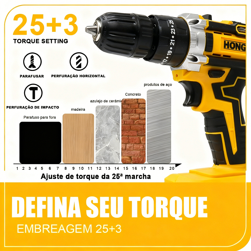 🔃🔃Tenha em mãos a ferramenta ideal para qualquer projeto! A Furadeira e Parafusadeira 48V oferece potência e versatilidade. Com design ergonômico e sem fio, ela garante liberdade total de movimento em qualquer obra ou reparo. 🛠️ VANTAGENS E BENEFÍCIOS EXCLUSIVOS Alto Desempenho e Versatilidade: Ideal para perfurar e parafusar em metal, madeira e plástico. Essencial para construção, marcenaria e uso doméstico. Liberdade Sem Fio: Trabalhe com total autonomia, sem depender de tomadas. Opção 1 Bateria: Ideal para uso leve e ocasional. Opção 2 Baterias: Garante o dobro do tempo de trabalho, perfeito para longos projetos (Baterias 1.300 mAh, formato achatado). Conforto: Design ergonômico e Empunhadura Soft Grip para uso prolongado. Controle Preciso: Possui 17 opções de torque + 1 (perfuração) e velocidade variável/reversível, permitindo o ajuste perfeito para cada material. ⚙️ ESPECIFICAÇÕES TÉCNICAS E DETALHES Voltagem: 48V Torque Máximo: 32 N.M Opções de Torque: 17 + 1 (Perfuração) Rotação (sem carga): 0-400 / 0-1400 RPM Mandril: 3/8" (10mm) - Aperto Rápido Carregador: Bivolt Peso Total: 1.250 Kg Recursos Adicionais: Indicador de carga de bateria, Velocidade Variável e Reversível 📦 CONTEÚDO DA EMBALAGEM Seu kit acompanha uma maleta resistente e os acessórios essenciais. O número de baterias varia conforme a sua escolha na variação do produto: 01 Parafusadeira Furadeira 48V Baterias: 1 ou 2 unidades (Conforme a sua seleção) 01 Carregador Bivolt 01 Maleta para transporte (Resistente) 06 Brocas 09 Soquetes 06 Bits de parafuso 01 Extensor Flexível 01 Conector de Bits 01 Conector de broca de parafusadeira 📝 OBSERVAÇÕES IMPORTANTES Pronta Entrega: Itens em estoque para envio imediato. As imagens são meramente ilustrativas. As cores nas fotos podem variar de acordo com a resolução e brilho da sua tela.