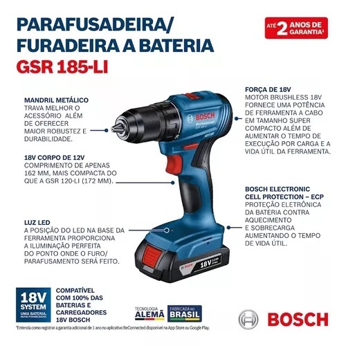 Furadeira Parafusadeira Bosch 2 Bateria 18v Gsr185 + Bat 4ah