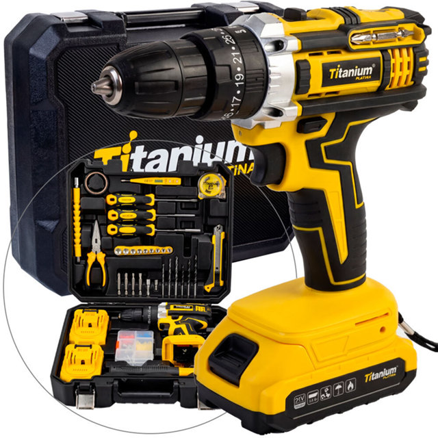 Catalogado na subcategoria Ferramentas (de Casa e Construção), Furadeira Parafusadeira de impacto a bateria 3/8" 21V com 2 baterias kit de ferramentas 136 peças - 7731 - Titanium está à venda na Shopee Brasil por R$ 299,90 (20% de desconto sobre o preço original de R$ 374,87).