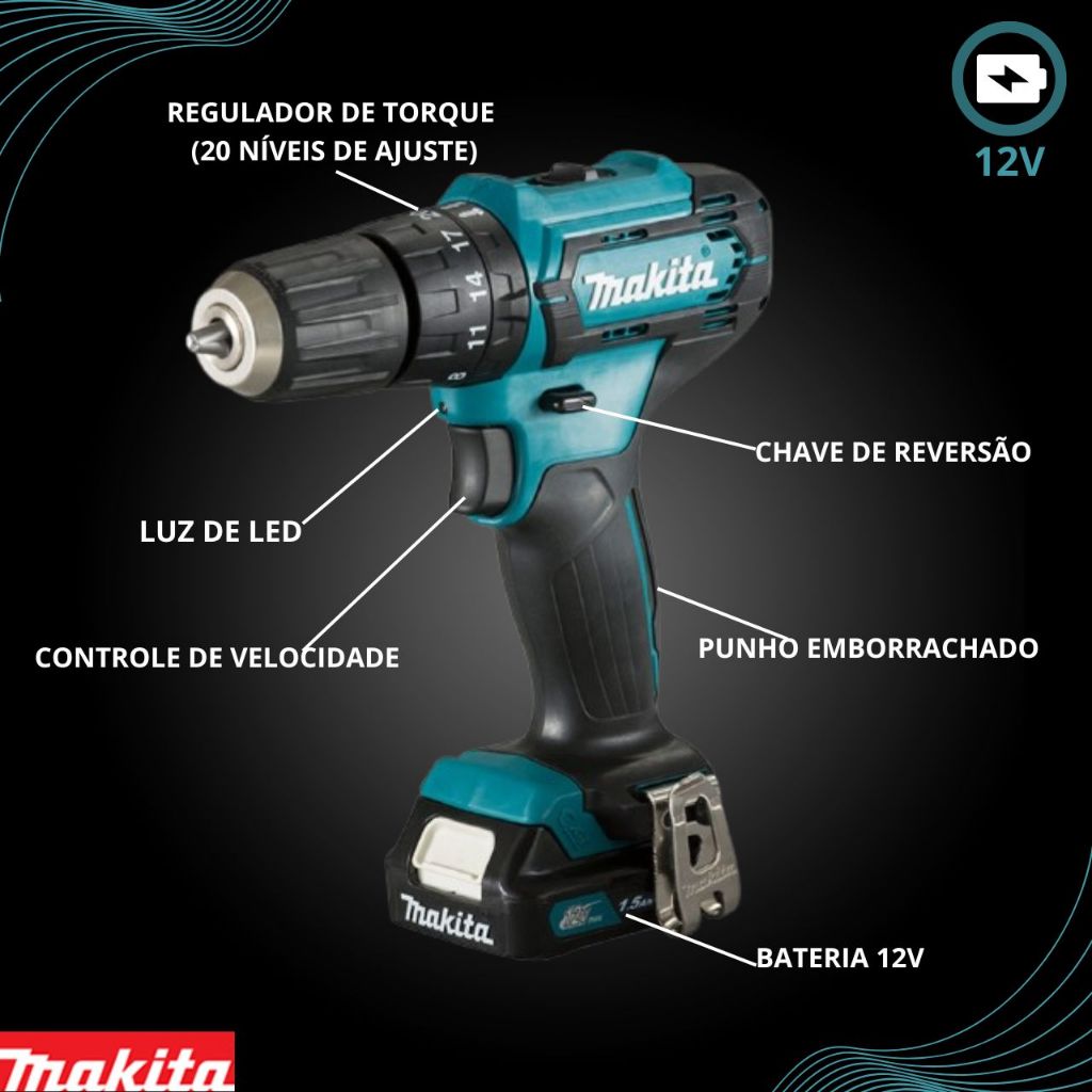 Furadeira Parafusadeira de Impacto Makita 12V HP333DWYX3 com Bateria e Carregador