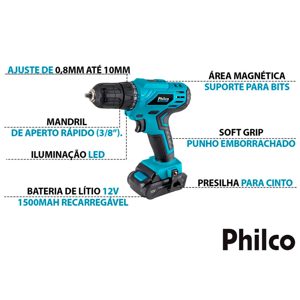 Furadeira Parafusadeira Sem Fio De 10mm Philco Ppf12m Acessórios Com Jogo Bits Brocas E Buchas 300 Peças