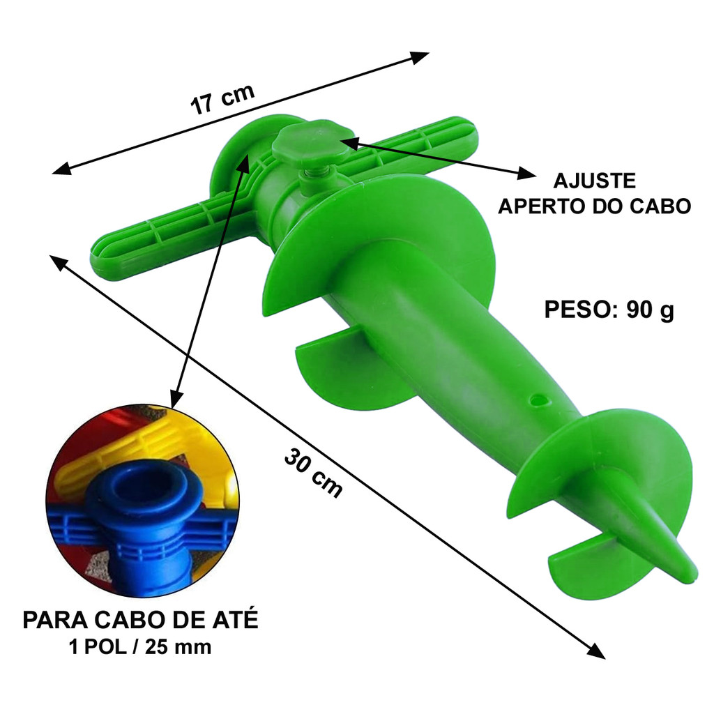Âncora para Guarda-Sol e Vara de Pesca – Suporte de Areia Tipo Broca Helicoidal (Cores Sortidas) A Âncora para Guarda-Sol é o acessório ideal para garantir estabilidade e segurança durante o uso em praias, campos ou áreas externas. Com design em formato de broca helicoidal, o fixador é projetado para ser enterrado facilmente na areia ou na terra, mantendo o guarda-sol ou vara de pesca firmemente preso mesmo em dias de vento forte. Fabricado em plástico de alta resistência, o suporte é leve, durável e prático de usar. Seu sistema ajustável permite o encaixe de diferentes diâmetros de hastes, proporcionando versatilidade e firmeza em qualquer tipo de solo. Características: Sistema: Tipo broca helicoidal (rosca de fixação na areia) Material: Plástico resistente de alta durabilidade Altura: 30 cm Largura: 17 cm (parte da alça) Furo: Para cabo de até 1 Pol. (25 mm) ou (32 mm) sem o redutor Peso: 90 g Ajuste de aperto para fixação do cabo Cores: Variadas (envio aleatório conforme disponibilidade) Versatilidade: Guarda-sol: Mantém o guarda-sol fixo e estável na areia, evitando que tombe ou se solte. Vara de pesca: Pode ser utilizado como suporte para varas de pesca, mantendo-as firmes e prontas para uso. Benefícios: Instalação rápida e sem ferramentas Evita acidentes e danos causados pelo vento Leve e fácil de transportar Alta resistência ao impacto e à exposição solar Ideal para praia, camping, pesca e lazer ao ar livre Diferenciais: Sistema helicoidal que garante ancoragem firme Compatível com diversos tipos e tamanhos de hastes Material durável que não enferruja, não deforma e não racha Design ergonômico e funcional Pacote: (01) Unidade – Âncora para Guarda-Sol e Vara de Pesca Envio: Imediato para todo o Brasil Produto embalado com proteção reforçada