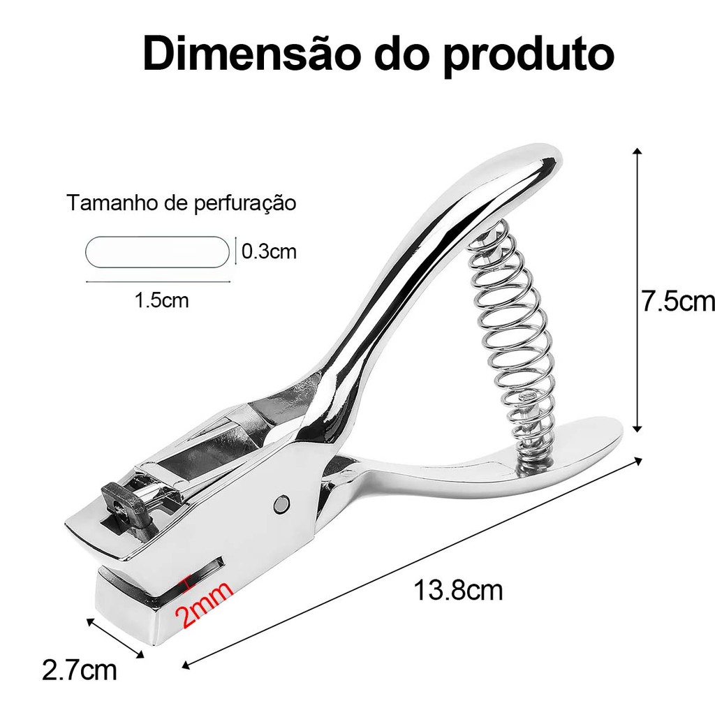 Olá Por favor, leia a descrição do anúncio e você encontrará a maioria das respostas! Por favor consulte a imagem para o tamanho do produto Lista de produtos: Furador*1 Material: Liga de zinco Tamanho do Slot (comprimento x largura): cerca de 15 x 3 mm Tamanho do furador: cerca de 13,8 x 2,7 x 7,5 cm; nota: Você pode jogar filme rígido de PVC abaixo de 1,0 MM, como cartões bancários, etc. Não dá para gravar filme acima de 1,2 MM, é muito trabalhoso e pode quebrar. Filmes com espessura inferior a 0,1 MM não podem ser perfurados e é fácil cardar a faca.