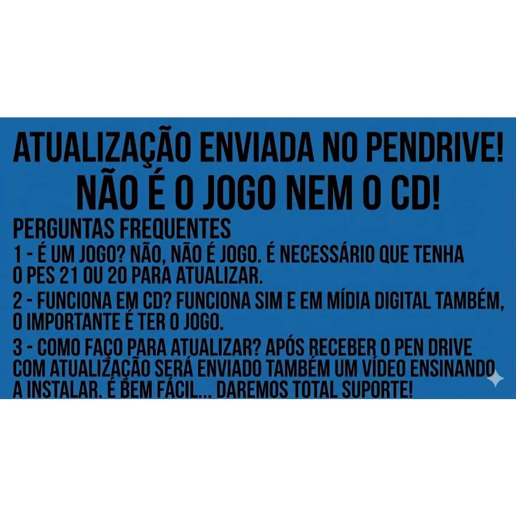 ATENÇÃO! *** ISSO SE TRATA DE UMA PROGRAMAÇÃO/EDIÇÃO ENVIADO NO PENDRIVE. É NECESSÁRIO TER O J0G0 2020 OU 2021. PARA INFORMAÇÕES ENVIE UMA MENSSAGEM NO CHAT. NOSSO PATCH É SUPER COMPLETO E 100 % ATUALIZADO. PRODUTO DE FÁCIL INSTALAÇÃO E DAREMOS TOTAL SUPORTE.