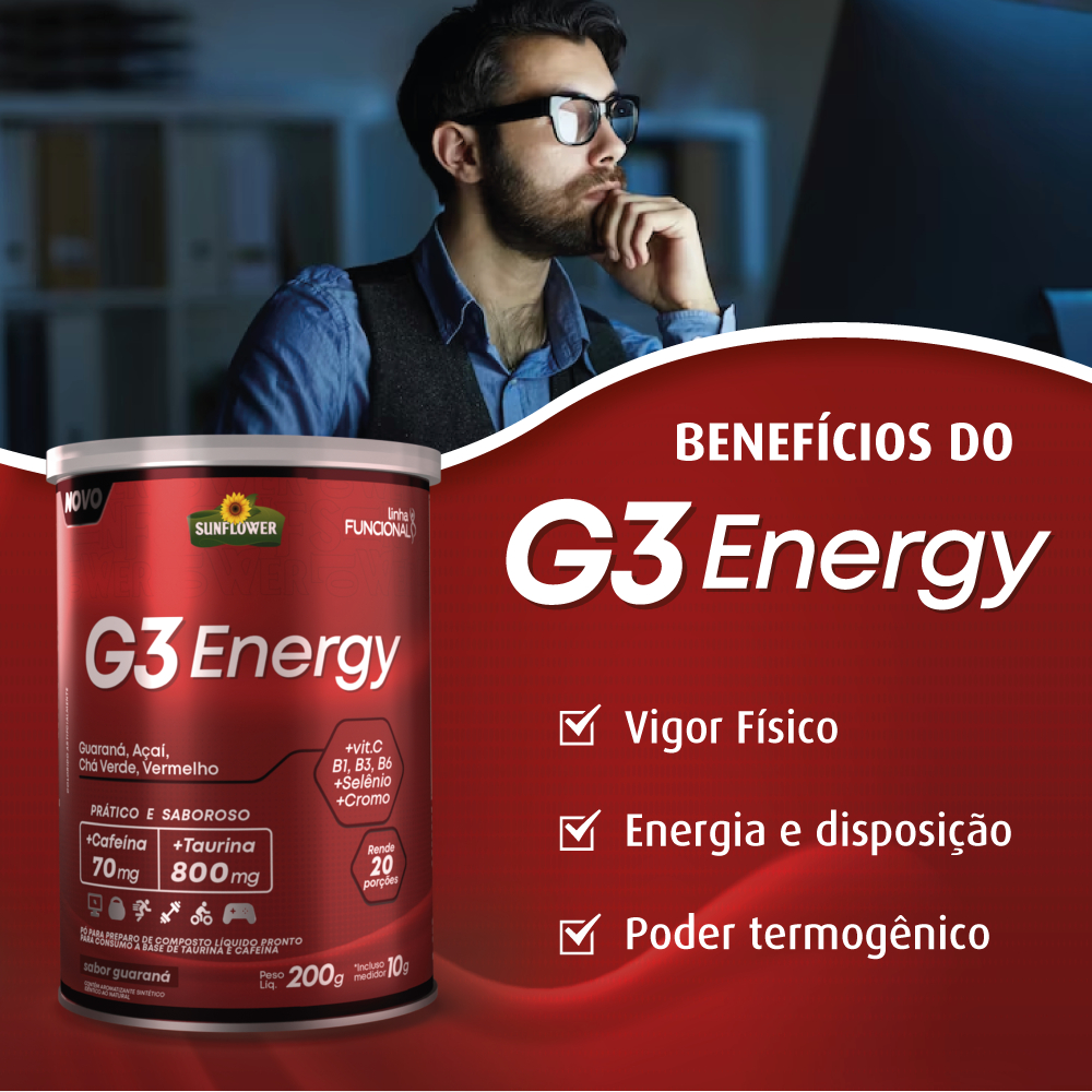 O que é o G3 Energy? O G3 Energy Sunflower é um suplemento alimentar desenvolvido para quem busca energia e foco antes do treino, sem exageros. Sua fórmula com 70 mg de cafeína oferece estímulo equilibrado, sendo uma excelente opção para uso noturno ou para pessoas sensíveis a estimulantes. Por que usar como pré-treino? ⚡ Auxilia na disposição e no estado de alerta 🧠 Melhora o foco e a concentração 💪 Taurina para suporte neuromuscular 🌙 Não atrapalha o sono quando usado à noite 🚫 Sem beta-alanina (sem formigamento) Composição Ativa Cafeína (70 mg) — energia controlada Taurina (800 mg) — desempenho e resistência Vitaminas C, B1, B3 e B6 — metabolismo energético Cromo e Selênio — suporte metabólico e antioxidante Açaí e Guaraná — energia de origem vegetal Modo de uso: Diluir 12 g (1 dosador) em 450 mL de água e consumir uma vez ao dia, preferencialmente antes do treino. ℹ️ Informações Importantes Produto indicado para adultos (≥ 19 anos). Não exceder a recomendação diária de consumo. Este produto não é um medicamento. Não consumir com bebida alcoólica. Gestantes, lactantes e pessoas com enfermidades devem consultar um médico. Produto dispensado de registro conforme RDC 843/2024. ⚡ Energia na medida certa para treinar melhor — até à noite!