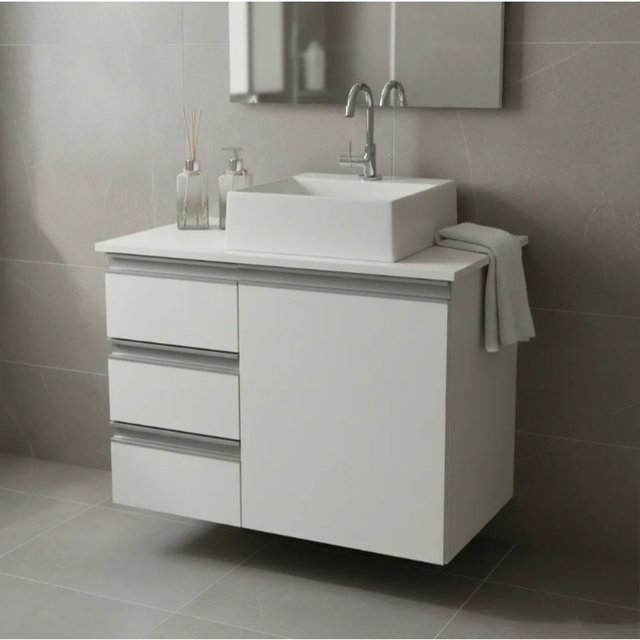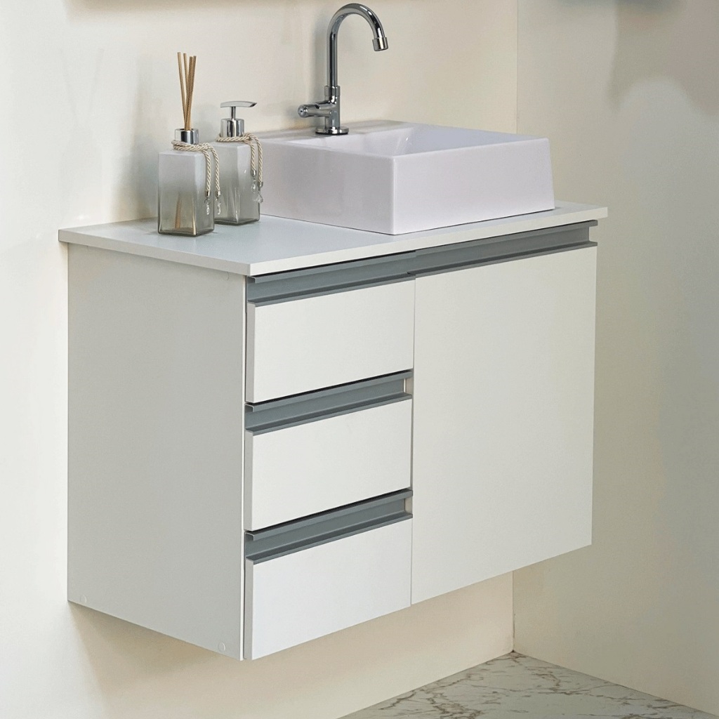 *PRODUTO ENTREGUE MONTADO* Armário Para Banheiro Com Tampo de MDF e Cuba - GAVETAS NA ESQUERDA NÃO ACOMPANHA ESPELHO E TORNEIRA INFORMAÇÕES: Marca: Marcenaria Timbó (@marcenariatimbo) Balcão na cor Branco MDF 15mm. Tampo em MDF 15mm. Material da Estrutura: MDF 15mm Branco TX. Espessura do Tampo (mm): 15 Puxador Perfil Alumínio Cuba em Mármore Sintético. SEM FUNDO INFORMAÇÕES ADICIONAIS: Balcão com 1 porta, 1 prateleira interna e 3 gavetas. Tampo em MDF COM FUROS PARA INSTALAR CUBA E TORNEIRA. Não necessita montagem, apenas fixação. Acompanha CANTONEIRAS COM CAPA PARA FIXAÇÃO, BUCHAS E PARAFUSOS. MEDIDAS: Balcão: 70cm largura x 50cm altura x 37cm profundidade Tampo: 72cm largura x 1,5cm altura x 38cm de profundidade Cuba Quadrada: 34,5cm largura x 10,2cm altura x 34,5cm de profundidade IMAGEM REAL DO PRODUTO – PODE SOFRER VARIAÇÃO DE COR DEVIDO AS FOTOS * PRODUTO ENTREGUE MONTADO*