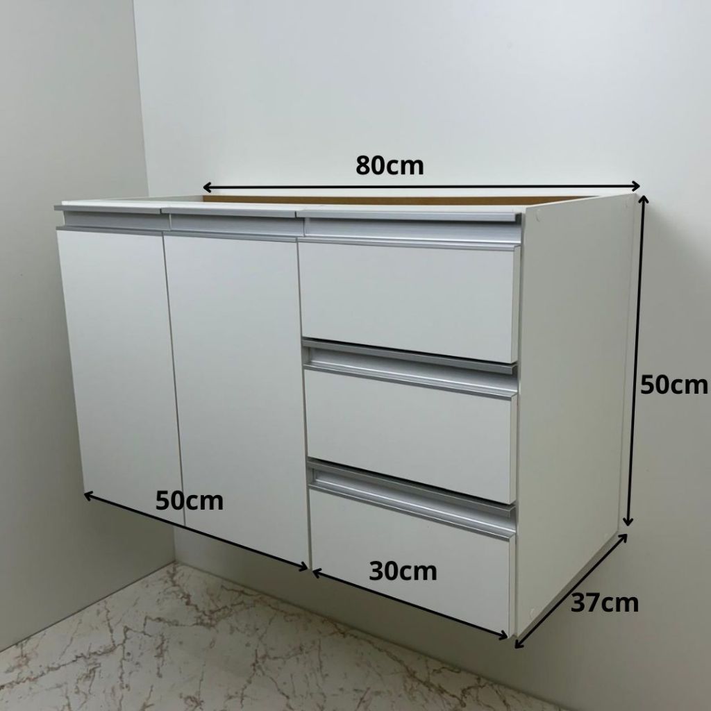 *PRODUTO ENTREGUE MONTADO* Armário Para Banheiro - GAVETAS NA DIREITA NÃO ACOMPANHA TAMPO, CUBA, ESPELHO E TORNEIRA INFORMAÇÕES: Marca: Marcenaria Timbó (@marcenariatimbo) Balcão na cor Branco MDF 15mm. Material da Estrutura: MDF 15mm Branco TX. Puxador Perfil Alumínio SEM FUNDO E TAMPO INFORMAÇÕES ADICIONAIS: Balcão com 2 portas, 1 prateleira interna e 3 gavetas. Não necessita montagem, apenas fixação. Acompanha CANTONEIRAS COM CAPA PARA FIXAÇÃO, BUCHAS E PARAFUSOS. MEDIDAS: Balcão: 80cm largura x 50cm altura x 37cm profundidade IMAGEM REAL DO PRODUTO – PODE SOFRER VARIAÇÃO DE COR DEVIDO AS FOTOS * PRODUTO ENTREGUE MONTADO*