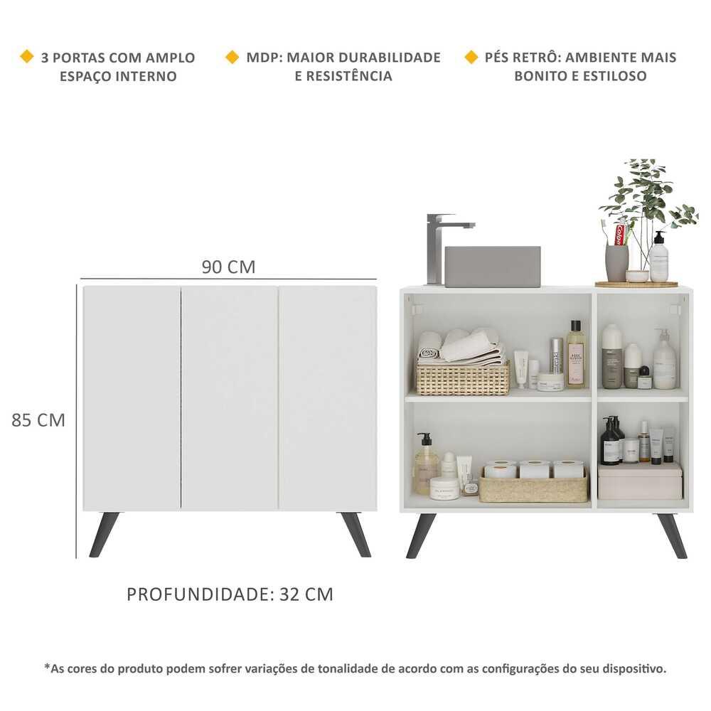 O Gabinete Banheiro 3 Portas Retrô 90cm Multimóveis MP5030 é produzido em MDP com acabamento acetinado (cerca de 20% de brilho), que garante maior durabilidade, facilidade na limpeza, além de um acabamento superior. Com 3 portas, possui um excelente espaço interno para organizar itens de higiene, toalhas e demais objetos (as prateleiras internas suportam 2 e 5 Kg e o tampo 7 Kg). Os pés retrô, em polipropileno, dão um charme especial ao móvel deixando-o com um visual leve e permitindo você compor um ambiente com ar vintage e moderno ao mesmo tempo. Uma ótima opção para deixar seu banheiro bonito, prático e organizado. Não acompanha torneira e cuba. Conteúdo da Embalagem: 1 (um) balcão 1 (um) kit com 4 pés retrô Dimensões do produto montado: Altura: 85cm | Largura: 90cm | Profundidade: 32cm *Você pode consultar as medidas internas na imagem técnica do produto. Cores Disponíveis: Branco - Branco/Preto - Branco/Natural - Preto - Preto/Branco - Preto/Natural *As cores do produto podem sofrer variações de tonalidade de acordo com as configurações do seu dispositivo. Imagem meramente ilustrativa. Decoração não acompanha o produto. O produto será entregue desmontado e não disponibilizamos o serviço de montagem.