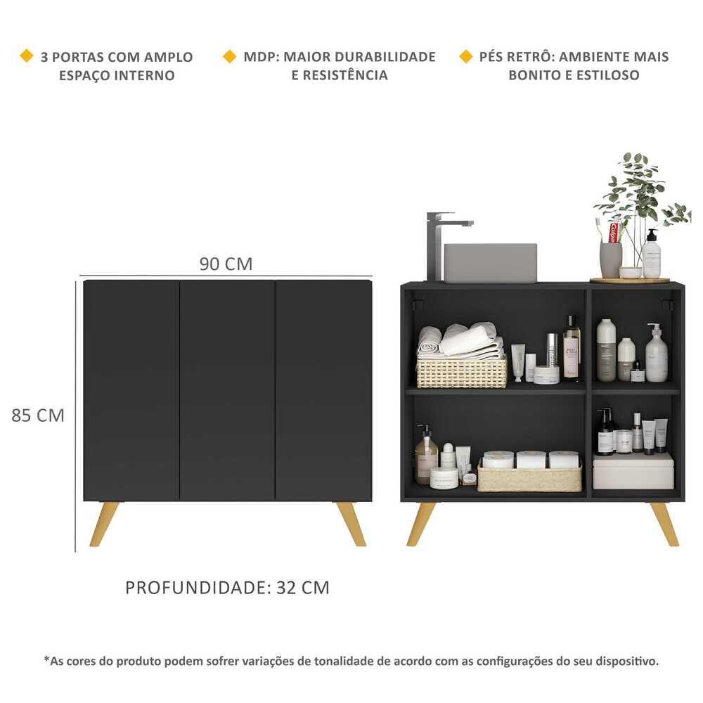 O Gabinete Banheiro 3 Portas Retrô 90cm Multimóveis MP5030 é produzido em MDP com acabamento acetinado (cerca de 20% de brilho), que garante maior durabilidade, facilidade na limpeza, além de um acabamento superior. Com 3 portas, possui um excelente espaço interno para organizar itens de higiene, toalhas e demais objetos (as prateleiras internas suportam 2 e 5 Kg e o tampo 7 Kg). Os pés retrô, em polipropileno, dão um charme especial ao móvel deixando-o com um visual leve e permitindo você compor um ambiente com ar vintage e moderno ao mesmo tempo. Uma ótima opção para deixar seu banheiro bonito, prático e organizado. Não acompanha torneira e cuba. Conteúdo da Embalagem: 1 (um) balcão 1 (um) kit com 4 pés retrô Dimensões do produto montado: Altura: 85cm | Largura: 90cm | Profundidade: 32cm *Você pode consultar as medidas internas na imagem técnica do produto. Cores Disponíveis: Branco - Branco/Preto - Branco/Natural - Preto - Preto/Branco - Preto/Natural *As cores do produto podem sofrer variações de tonalidade de acordo com as configurações do seu dispositivo. Imagem meramente ilustrativa. Decoração não acompanha o produto. O produto será entregue desmontado e não disponibilizamos o serviço de montagem.