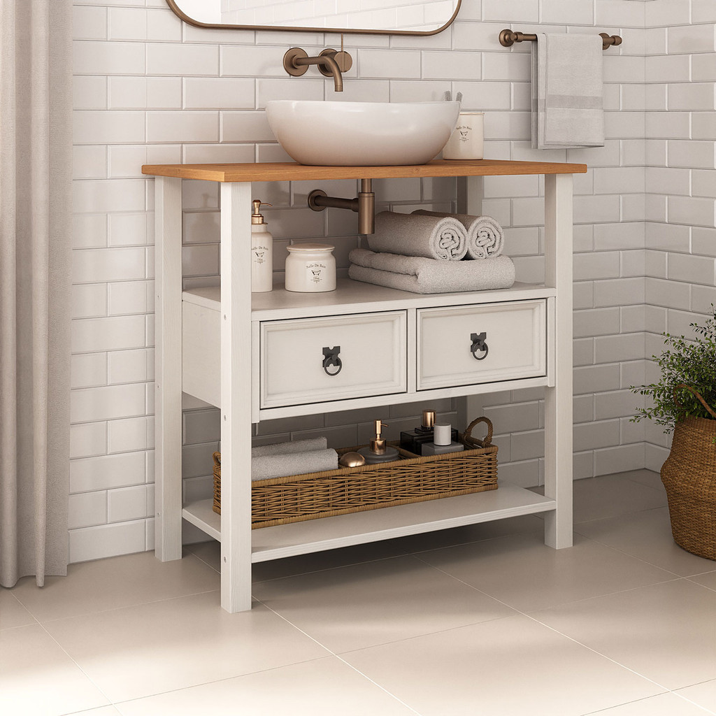 O Gabinete Aparador para Banheiro Madeira Maciça Tequila traz o equilíbrio perfeito entre estilo rústico-chic e funcionalidade, tornando seu banheiro ou lavabo um espaço elegante e bem organizado. Feito em madeira maciça, combina a estrutura na cor branca com o tampo em Freijó, proporcionando um contraste sofisticado e atemporal. Projetado para banheiros sofisticados, o Gabinete Para Banheiro Tequila conta com um tampo resistente já perfurado para instalação de cuba, tornando a adaptação prática e funcional. Suas duas gavetas espaçosas oferecem um armazenamento discreto para itens essenciais, enquanto a prateleira inferior ampla permite acomodar toalhas, cestos e objetos decorativos, garantindo mais organização no dia a dia. Com design refinado, estrutura robusta e fácil montagem, o Tequila é a escolha ideal para quem deseja um banheiro elegante, bem planejado e cheio de personalidade. Dimensões do Produto Largura: 80 cm Altura: 77,5 cm Profundidade: 40 cm Peso: 16 Kg Materiais e Acabamento Material da Estrutura: Madeira Maciça - Finger Tipo da Madeira: Pinus Fundos da Gaveta: MDF Puxadores: Metal Preto Escala de Brilho: Fosco Material dos Pés: Pinus Maciço Recomendação de Limpeza: Utilize pano levemente úmido Características do Produto Possui Gavetas: Sim Quantidade de Gavetas: 2 Gavetas Estilo: Moderno Suporte: Sim, para livros Ambiente Principal: Quarto Adulto Precisa de Montagem: Sim Sistema de Montagem: Minifix / Cavilhas / Parafusos. Complexidade da Montagem: Médio Volumes: 01 Garantia do Fabricante: 12 meses Montagem: Recomendamos que seja feita por um profissional. Manual de Montagem: Sim Padrão de Cor: Nossa tinta à base de água é uma opção ecologicamente consciente e segura para a pintura, além disso, a tinta a base de água permite uma visualização dos veios da madeira, indicando robustez do produto. Madeira Maciça: Nossa madeira é proveniente de recursos naturais e é tratada de forma ecologicamente correta para o bem do meio ambiente. Sua resistência e vida útil é superior a móveis de chapa MDF utilizadas pelo mercado. Nossa madeira possui mais resistência ao desgaste natural do tempo, agregando mais durabilidade ao seu produto. Pensando na qualidade dos produtos, possuímos equipes de controle de qualidade para selecionar madeiras ideais para seu produto. Diferenciais: - Produto Versátil - Design Moderno - Madeira Maciça - Mais Resistente que MDF - Móvel Sustentável - Madeira Certificada - Pintura Livre de Solventes - MDF Livre de Formaldeído - Produto Qualidade Europeia Informações Importantes: - Montagem e Desmontagem não inclusa ao produto, de responsabilidade do cliente. - Não nos responsabilizamos, no ato da entrega, por subir escadas/elevadores ou transporte por guincho em apartamentos. Eventuais despesas são de responsabilidade do comprador. - Ao receber a mercadoria, o cliente deve verificar as condições da embalagem, caso haja alguma avaria não assine o comprovante de recebimento. - Objetos que ambientam as fotos não acompanham o produto. - Imagens meramente ilustrativas. Cores e tonalidades podem variar. - O conjunto não pode ficar exposto ao Sol ou Chuva.