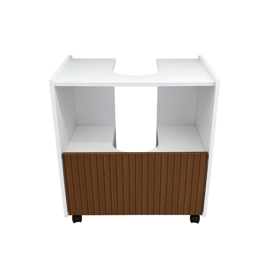 Gabinete Coluna para Pia de banheiro 1 Porta e com Prateleira Organizadora Branco Gabinete para banheiro destinado a lavatórios de coluna. Seu design permite que o gabinete fique posicionado abaixo do lavatório entre a coluna, possui 4 rodízios e um total de 3 prateleiras. Elaborado em MDP. Pintura da superfície em verniz poliéster brilhante, com secagem UV e impressão a laser. Acabamento nas bordas com fita de papel decorativo. Limpar com flanela ou pano macio seco, não utilizar produtos abrasivos, desengordurantes, álcool ou solvente. Não expor o produto diretamente à luz solar e à umidade Dimensões do produto: Gabinete: Altura: 61,5 cm Largura: 55 cm Profundidade: 34,8 cm