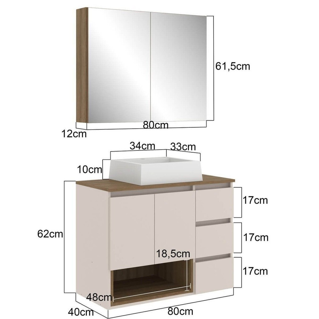 Gabinete de Banheiro 80cm Vitória com Espelheira e Cuba Mel/Arenas