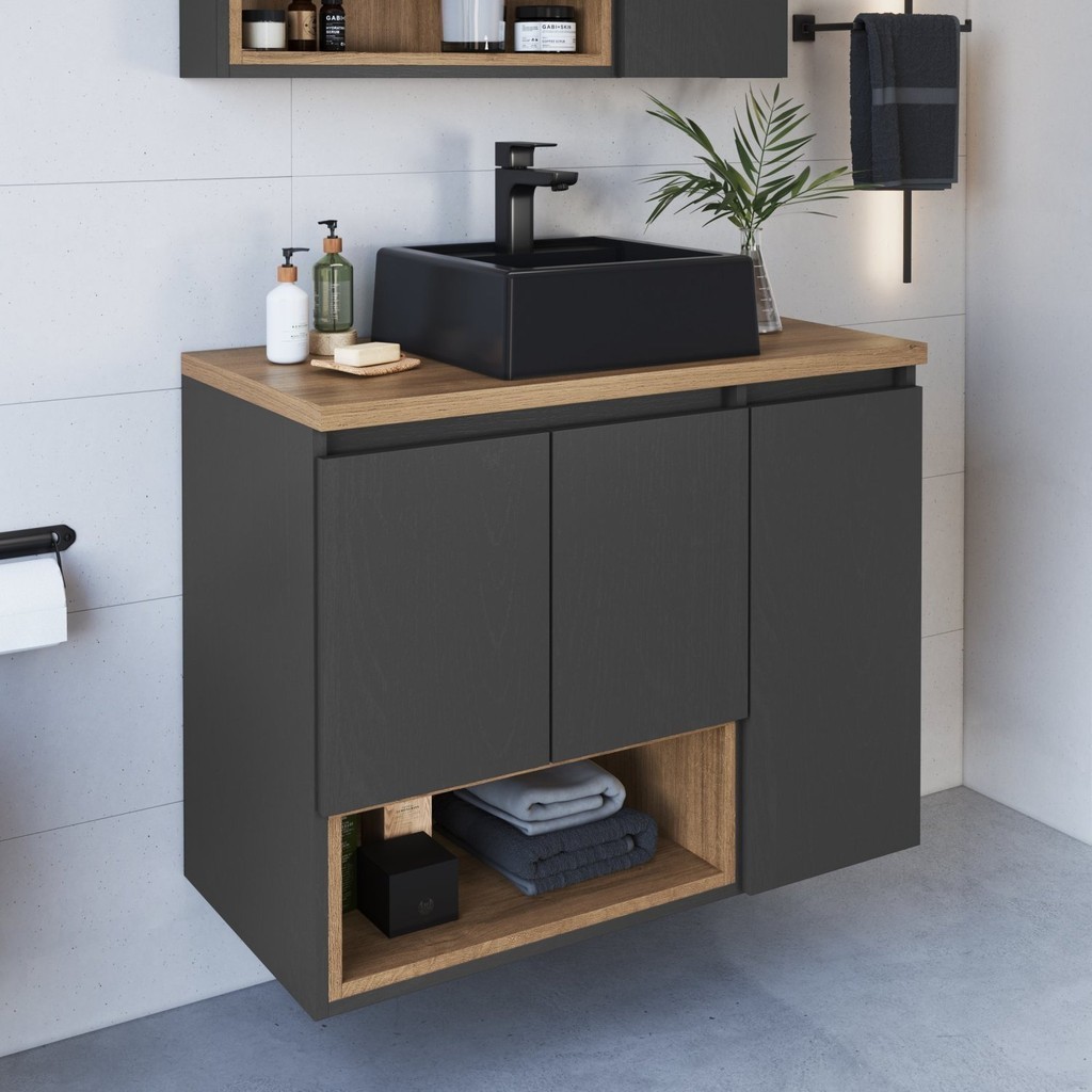 Gabinete de Banheiro Suspenso 80cm Cecília com 3 Portas e 1 Nicho com Cuba Mel/Grafite