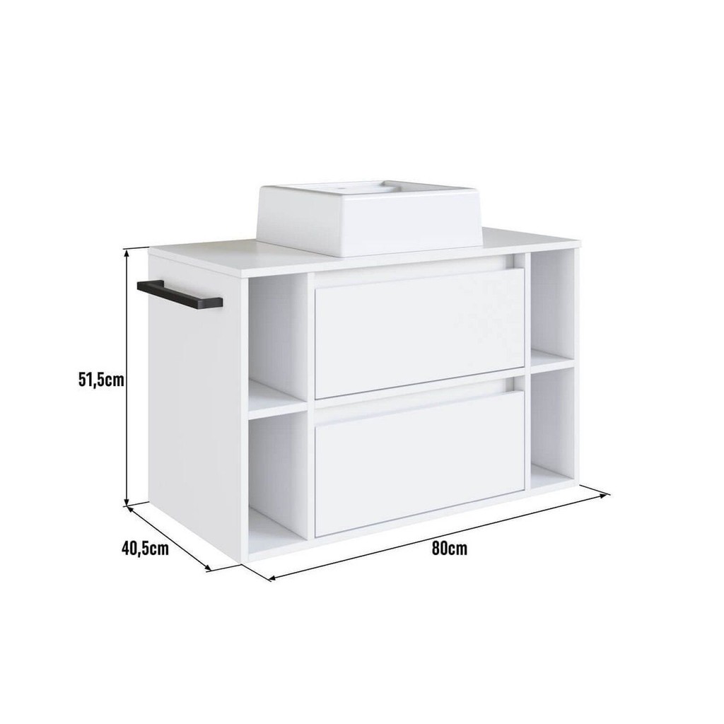 Gabinete de Banheiro Suspenso 80cm com 4 Nichos 1 Toalheiro 1 Porta 1 Gaveta com Cuba Branco