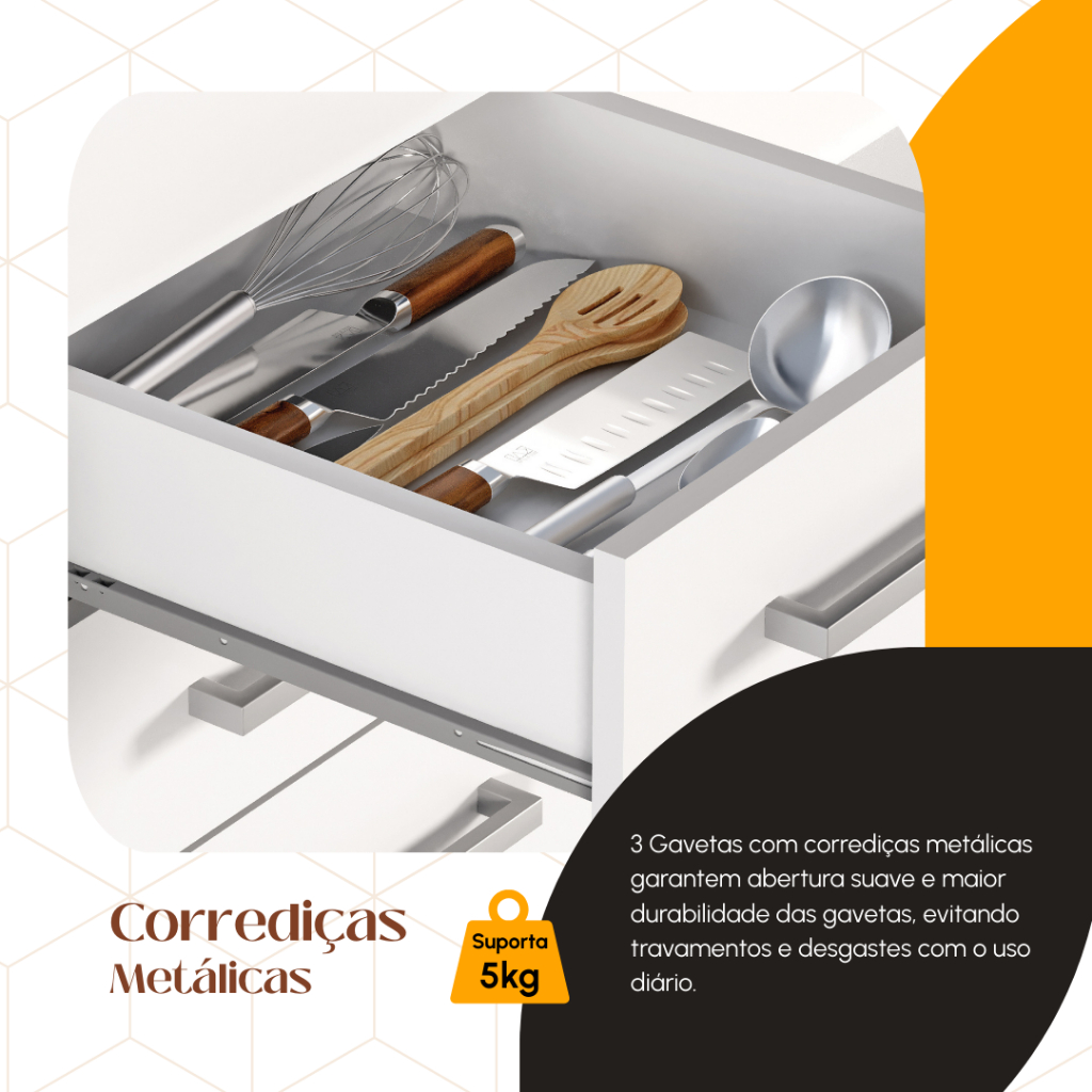 Transforme sua cozinha ou banheiro em um ambiente mais prático e elegante com o Gabinete para Pia Gêmeos 2,00m. Ideal para quem busca organização, durabilidade e um design moderno, este gabinete é fabricado em MDP resistente e possui acabamento em Touch Alto-Relevo ou Alto Brilho UV, valorizando a decoração do ambiente. NÃO ACOMPANHA PIA Características do Gabinete Gêmeos 2,00m: • 4 portas com puxadores em PVC • 1 prateleira internaque suporta 7kg; • 3 gavetas com corrediça metálica; • Estrutura que Suporta até 20kg; • Fabricado em MDP; • 6 pés de apoio; • Acabamento Touch Alto-Relevo ou Alto Brilho UV; • Manual de montagem incluso; Medidas Totais: Altura: 82 cm | Largura: 194 cm | Profundidade: 53,5 cm | Peso: 40 kg Medidas das gavetas: Gavetas 1 e 2: 37,5 cm (largura) x 14,7 cm (altura) x 38 cm (profundidade) Gaveta 3: 37,5 cm (largura) x 33,7 cm (altura) x 38 cm (profundidade) Não nos responsabilizamos pela montagem do produto. Recomendamos a contratação de um montador profissional.