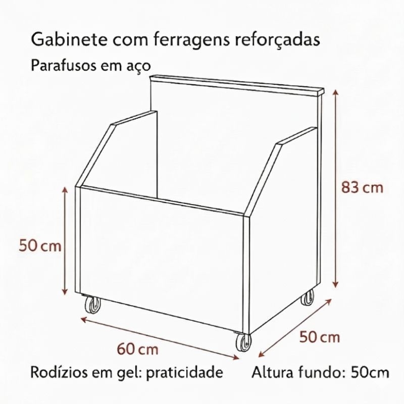 Mais espaço, mais praticidade! Esse gabinete para lavanderia é a escolha ideal para quem busca funcionalidade, durabilidade e acabamento de móveis planejados. : • Medidas: 83cm (Frente Já com rodízios) 60cm (largura) 50cm (profundidade) 50cm (altura fundo) FABRICAMOS TAMBÉM SOB MEDIDA Vai lá se mexe, pega a trena, meça seu espaço e utensílios, planeje. NOS CHAME NO CHAT PARA ORÇAMENTOS SOB MEDIDAS NÃO INCLUÍ PUXADOR. IMAGEM ILUSTRATIVA Principais características • Acabamento premium com fita de borda em PVC, o mesmo utilizado em móveis planejados. • Rodízios em gel que deslizam com leveza e não riscam o piso. • Ferragens reforçadas. Parafusos em aço, para máxima resistência. • Design moderno sem puxador, mais seguro e fácil de limpar. • Ideal para organizar produtos de limpeza, panos, baldes ou roupas sujas. • Cabe perfeitamente sob tanques, ocupando pouco espaço. ATENÇÃO: Produto enviado desmontado, com todos os itens necessários para montagem. Envio Imediato! Pedidos confirmados até às 12h são enviados no mesmo dia! 📦 Embalagem Reforçada Seu produto chega bem protegido! Utilizamos embalagens seguras e resistentes, com proteção extra nos cantos e fita reforçada, garantindo que ele chegue intacto até você. 🚚 Entrega Mais Rápida do Setor Aqui você não espera! Nosso processo é ágil e enviamos em tempo recorde, com o cuidado e atenção que seu pedido merece.
