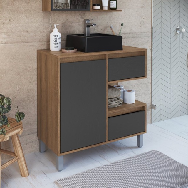 Gabinete para Banheiro 80cm 2 Gavetas 1 Porta 1 Nicho Paula Mel/Grafite