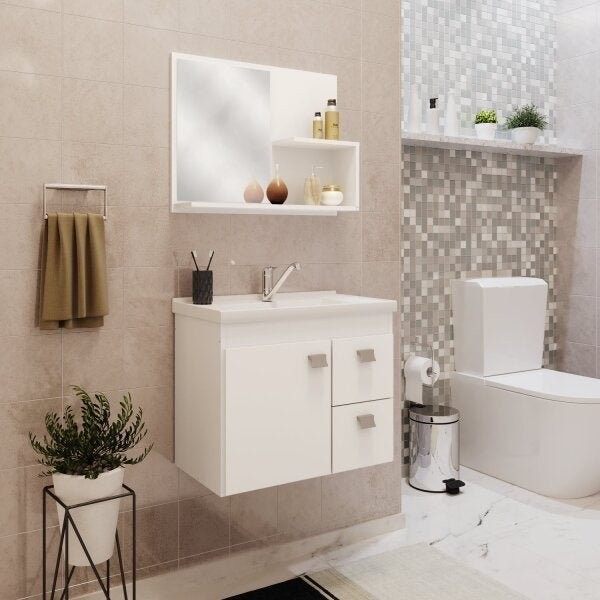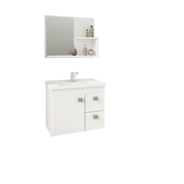 O Gabinete suspenso para Banheiro com Cuba Isa é desenvolvido com estrutura em MDF 12 mm/MDP 15 mm, acabamento em pintura U.V.. Com Cuba em mármore sintético, corrediças telescópicas puxador plástico polipropileno, características que garantem melhor mais durabilidade e resistência ao produto. Além disso tudo, o conjunto ainda acompanha uma linda Espelheira com espelho 3 mm, 1 prateleira, duas gavetas e 1 nicho para você guardar sua escova de dentes, creme dental, etc. Aproveite e adquira já o seu conjunto para deixar o seu ambiente ainda mais charmoso e elegante. Estilo: Moderno Peso (kg): 16.2 Garantia: 03 Meses Acabamento: Pintura UV Possui Pés: Não Cor da Cuba: Branco Tipo de Cuba: Semi-Encaixe Possui Portas: Sim Tipo de Porta: Bater Acompanha Cuba: Sim Possui Gavetas: Sim Possui Rodízio: Não Suporta Até (kg): 20 Acompanha Tampo: Não Possui Espelhos: Sim Possui Gabinete: Sim Escala de Brilho: Semi-Brilho Gaveta com Chave: Não Material da Cuba: Mármore Sintético Acompanha Válvula: Não Material da Porta: MDF O Conjunto Contém: Gabinete com Cuba e Espelheira Origem do Produto: Nacional Possui Espelheira: Sim Possui Iluminação: Não Acabamento da Cuba: Pintura UV Ambiente Principal: Banheiro Formato do Espelho: Retangular Material da Gaveta: MDF Material Principal: MDF Possui Prateleiras: Sim Acabamento da Porta: Pintura UV Tamanho do Gabinete: Pequeno: Abaixo de 60cm de largura Acabamento da Gaveta: Pintura UV Espessura do Espelho: 3 Material da Prateleira: MDF Peso Máximo por Gaveta: 3 Acabamento da Prateleira: Pintura UV Tipo de Puxador da Porta: Externo Escala de Brilho da Porta: Semi-Brilho Tipo de Puxador da Gaveta: Externo Escala de Brilho da Gaveta: Semi-Brilho Peso Máximo por Prateleira: 4 Tipo de Corrediça da Gaveta: Metálica Telescópica Furação Para Cuba e Torneira: Sim Material do Puxador da Porta: Plástico Material do Puxador da Gaveta: Plástico Escala de Brilho da Prateleira: Super-Brilho Possui Recorte No Tampo Para Cuba: Sim Tipo de Dobradiça/Corrediça da Porta: Metálica Possui Recorte No Tampo Para Misturador: Sim Marca: MGM Móveis Cor Flex: Não Cor Interna: Branco Cor: Branco Cor do Produto: Branco Cor Predominante: Branco Linha ou Coleção: Bia Medida da Cuba (C x L x P): 46cm x 55cm x 31,5cm Tamanho do Espelho (A x L): 40cm x 30cm Medida do Gabinete (A x L x P): 46cm x 55cm x 31,5cm Quantidade de Portas: 1 Porta Quantidade de Gavetas: 02 Gavetas Medida da Espelheira (A x L x P): 44cm x 55cm x 13,7cm