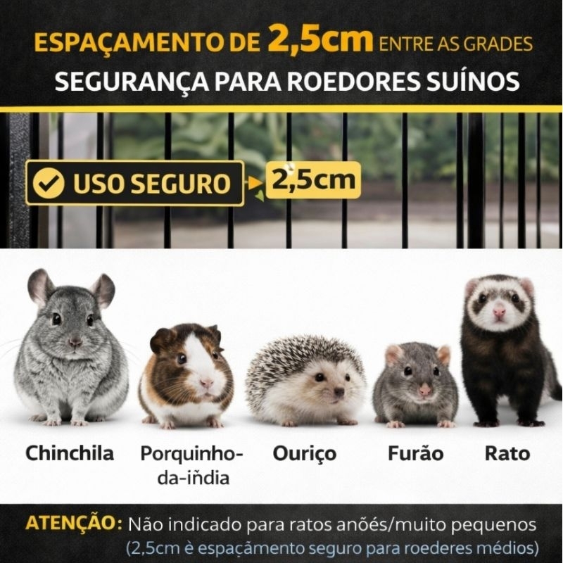 A Gaiola para Pequenos Roedores Preta foi desenvolvida para oferecer segurança, conforto e praticidade no dia a dia. Com estrutura reforçada e espaço interno amplo, é ideal para quem busca um ambiente adequado e durável para seus pets. Seu design permite boa circulação de ar, garantindo um ambiente mais saudável, além de facilitar o acesso para limpeza e manejo diário. Indicada para: Porquinho-da-Índia Chinchila Coelho Furão Outros pequenos animais de porte semelhante Principais benefícios: Estrutura reforçada: mais resistência e durabilidade Espaçosa: maior liberdade de movimento para o animal Segura: reduz riscos de fuga Fácil de limpar: manutenção prática e rápida Excelente ventilação: conforto térmico para o pet Ideal tanto para uso doméstico quanto para quem busca uma gaiola funcional, robusta e fácil de manter. Produto enviado bem embalado. Em caso de dúvidas, utilize o campo de perguntas. * Imagens ilustrativas Conteúdo da embalagem: - 1x Gaiola ; - 1x Bandeja de dejetos removível; - 1x Comedouro; - 1x Kit de rodinhas de locomoção; - 1x Bebedouro.