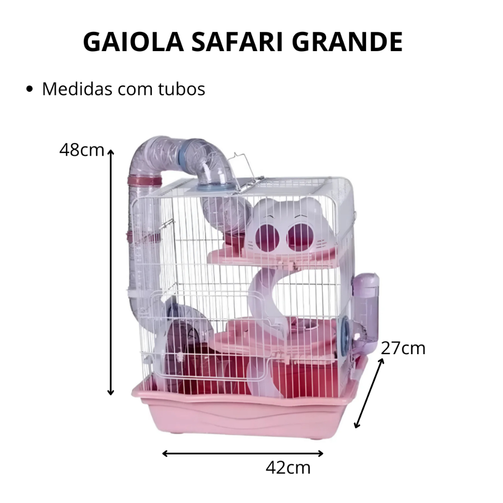 GAIOLA SAFARI GRANDE 635 PRODUTO ORIGINAL A PRONTA ENTREGA Gaiola Labirinto Safari para Hamster em ferro e super espaçoso, rodinha de exercícios, escorregador, toca e labirintos em acrílico. - Ideal para hamster sírio, anão russo e chinês; - Alta qualidade de fabricação e detalhe; - Completa, todos acessórios para criar seu hamster; - Super fácil de limpar, basta abrir as travas e retirar a grade; * Acompanha: - 1 casinha, - 1 rodinha, - 1 bebedouro 125ml, - 1 comedouro, - 2 rampas, - 1 tubo para fechamento, alça, - 10 pares de tubos transparentes e sistema de travas laterais CARACTERÍSTICAS DO PRODUTO: Indicado para: Roedores Porte: Pequeno Tipo de Material: Ferro e Plástico DIMENSÕES DO PRODUTO SEM TUBOS Altura: 40,5cm Largura: 26,6cm Comprimento: 35,5cm Espaçamento Das Grades: 1cm DIMENSÕES DO PRODUTO COM TUBOS Altura: 48cm Largura: 27cm Comprimento: 42cm