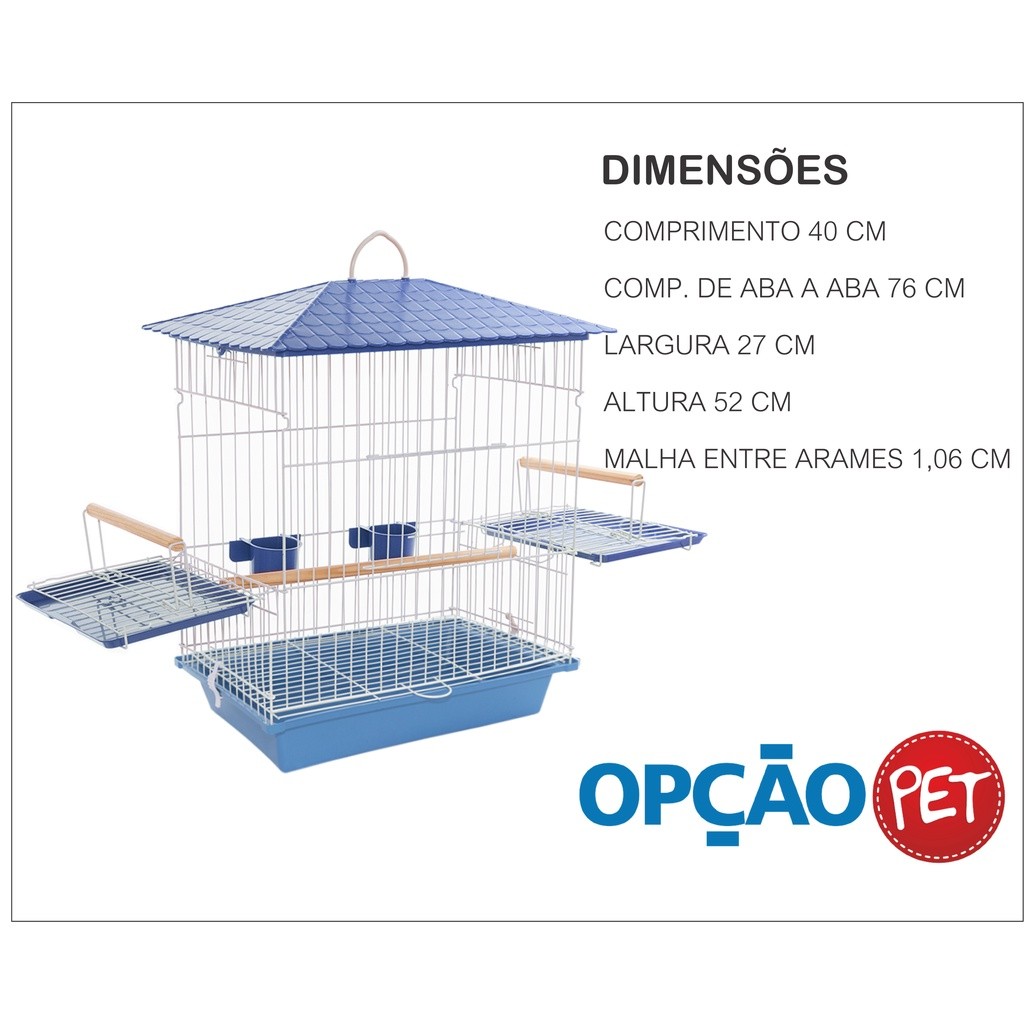 Uma linda gaiola da marca OPÇÃO PET na medida de 52 cm de altura, 40 cm de comprimento e 27 cm de largura. O produto vem em uma caixa e desmontada. A montagem é muito simples e prática, basta desdobrar o produto e fixar com presilhas a bandeja higiênica e no teto com a trava que tem na lateral do aramado. O corpo da gaiola é em aramado com espaçamento de 16mm entre as malhas. A pintura é eletrostática (Epóxi) que propõe uma durabilidade superior as galvanizadas. Trata-se da mesma pintura de uma grade de refrigerador. Acompanha todos os acessórios conforme a foto, não necessitando a compra de bebedouros e comedouros poleiros e outros. Itens que acompanha: • 1 Telhado plástico • 1 Bandeja plástica • 2 Bandejas plástica laterais • 1 Alça para o teto • 3 Presilhas plásticas • 2 Poleiro de madeira com 27 cm • 2 Poleiro de madeira com 23 cm • 1 Jogo de argolas • 2 Comedouro/Bebedouro plástico • 1 Aramado