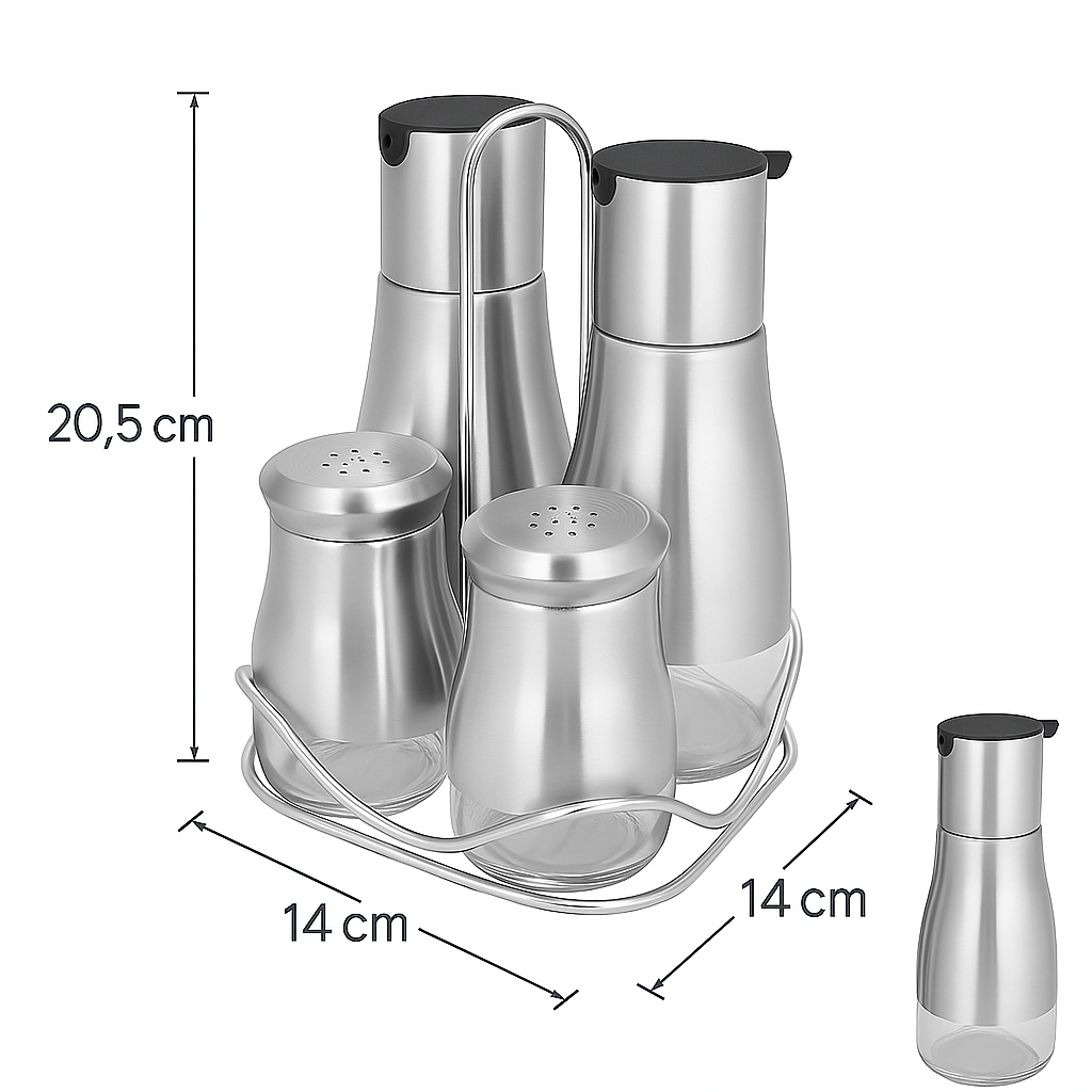 Galheteiro luxo 4 Peças com Suporte (Aço Inox e Vidro) Porta Azeite, Vinagre, Sal e Pimenta