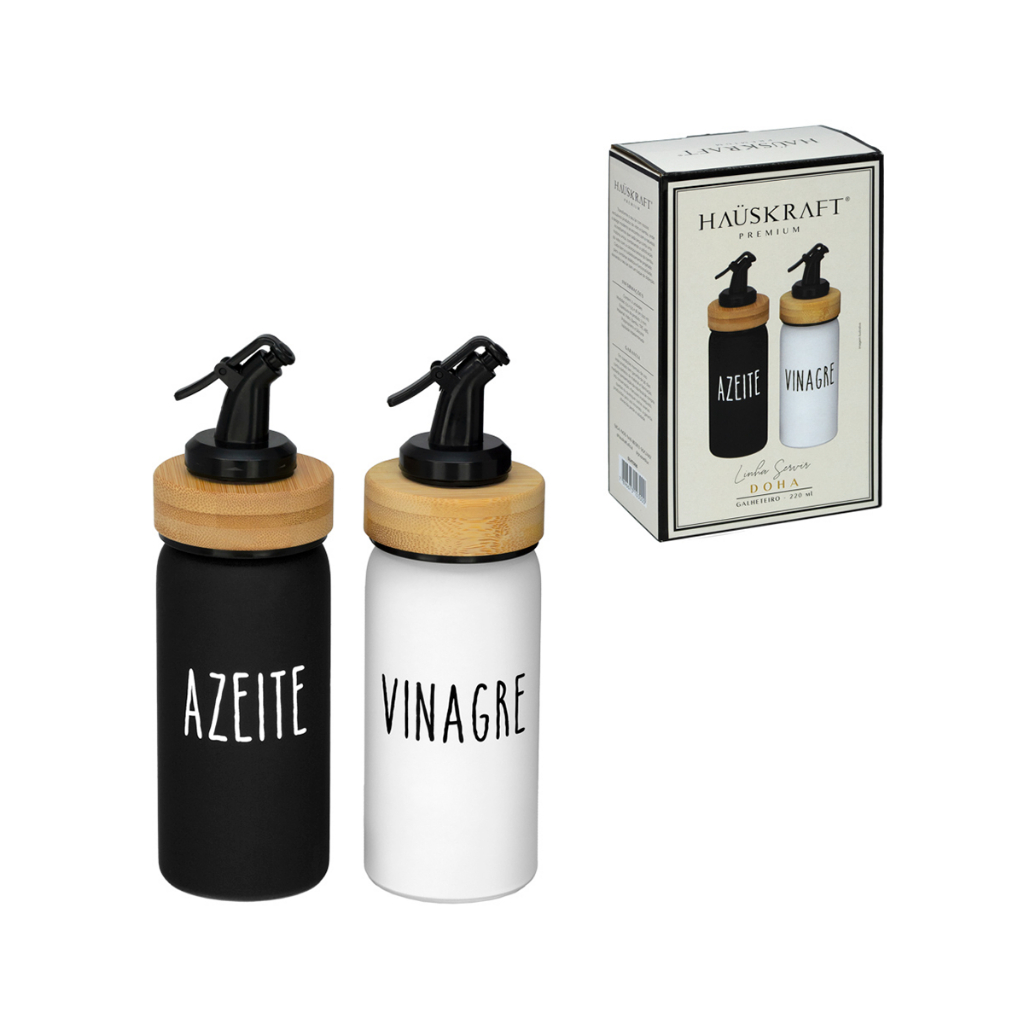 GALHETEIRO PORTA AZEITE E VINAGRE DOHA EM VIDRO 220ML Leve mais charme e organização à sua mesa ou cozinha com o Galheteiro Hauskraft Porta Azeite e Vinagre 220ml! Ideal para quem valoriza praticidade, elegância e funcionalidade no dia a dia. Composto por dois frascos em vidro de alta qualidade nas cores preto e branco, este conjunto conta com uma base sofisticada em bambu natural, que proporciona um toque rústico e moderno ao ambiente. Perfeito para armazenar azeite, vinagre, molhos ou temperos líquidos de forma prática e higiênica. COMPOSIÇÃO Vidro e Bambu. CONTEÚDO 01 Porta Azeite. 01 Porta Vinagre. ---------------------------------------------------------------------------------------- PERGUNTAS FREQUENTES: - Possui estoque? Todos os nossos produtos estão em estoque, a pronta entrega. - Envia para todo o Brasil? Sim, nossas entregas são feitas para todo o Brasil com praticidade e segurança para sua compra. - Posso retirar o produto? Em breve liberaremos a opção de retirada. Por enquanto estamos trabalhando somente com envios Estamos a disposição para qualquer outra dúvida. Mande-nos no campo de perguntas, responderemos rapidinho! Boas compras! Atenciosamente, Equipe Vale Lar.