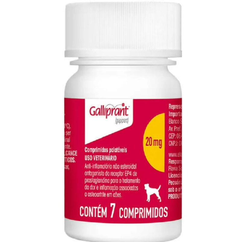 PRODUTO ORIGINAL COM NOTA FISCAL! - - - - - DESCRIÇÃO: Galliprant 20mg é um anti-inflamatório em forma de comprimidos palatáveis indicado no tratamento da dor e inflamação associados a osteoartrite em cães. O produto foi desenvolvido para levar bem-estar para cães portadores desta doença, de forma segura. É recomendado para uso por curto, médio e longo prazo, sem riscos para a saúde do animal, com perfil de segurança exclusivo na manutenção das funções gastrointestinais, renais e hepáticas. Galliprant apresenta um exclusivo modo de ação, pois é antagonista seletivo do receptor EP4, da classe dos piprants. O receptor EP4 é o responsável primário por mediar a dor e a inflamação associadas à osteoartrite canina. Galliprant não é um inibidor das cicloxigenases (COX), não afetando a produção dos prostanoides (prostaglandinas) e não interferindo nos mecanismos homeostáticos mediados por outros receptores. As vias dos prostanoides são importantes para a manutenção do equilíbrio funcional no sistema gastrointestinal, rins e fígado. - Tratamento da dor; - Tratamento osteoartrite em cães; - Comprimidos são palatáveis e sulcados; - Disponível em três concentrações (consulte-nos). - - - - - MODO DE USO: Galliprant deve ser administrado por via oral, com ou sem alimento, uma vez ao dia, na dose recomendada de 2mg/kg de peso corporal (equivalente a uma faixa de dosagem de 1,5 a 2,9mg/kg de peso corporal). Não há período máximo de duração do tratamento e este deve ser SEMPRE supervisionado pelo médico veterinário. - - - - - Enviamos o seu pedido o quanto antes possível! Obrigado pela preferência.