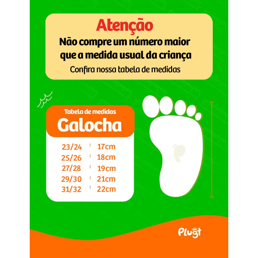 Diferencial Plugt Calçados feitos para a diversão! Super leves com micro-bolhas de ar, fofinhos e cheios de estilo, perfeitos para acompanhar todas as aventuras das crianças sem perder o charme e a praticidade. Além disso, são livres de ftalatos, garantindo ainda mais segurança para os pezinhos! Com eles, as crianças ficam livres para brincar o dia todo! Galocha Infantil Unicórnio 3D Rosa – Magia e Conforto para os Pequenos A Galocha Plugt Unicórnio 3D Rosa é perfeita para quem busca um calçado fashion, delicado e encantador. Inspirada em um dos personagens mais mágicos do imaginário infantil, traz detalhes fofos e um chifre 3D multicolorido que adiciona um toque especial ao visual. Fabricada em PVC microexpandido, é leve, macia e confortável. Possui solado antiderrapante e uma abertura traseira que facilita o calce, garantindo um ajuste seguro nos pés. Ideal para dias chuvosos ou para compor looks cheios de estilo. Tabela de Medidas (Comprimento da Palmilha em CM) 23/24 - 17 cm 25/26 - 18 cm 27/28 - 19 cm 29/30 - 21 cm 31/32 - 22 cm Altura Média do Cano Do chão até a alça: 17 cm Principais Dúvidas O material é impermeável? Sim, ideal para dias chuvosos. A palmilha é removível? Sim, facilitando a higienização. A abertura traseira ajuda no calce? Sim, tornando mais fácil de colocar e tirar. O solado escorrega? Não, ele possui tecnologia antiderrapante para maior segurança. Sobre a Plugt Desde 2001, a Plugt é líder no desenvolvimento e produção de calçados injetados para crianças no Brasil e em mais de 20 países. Tecnologia, inovação e design estratégico estão presentes em cada etapa da construção dos produtos e serviços. Criamos calçados divertidos, seguros e confortáveis para a criança ser criança.