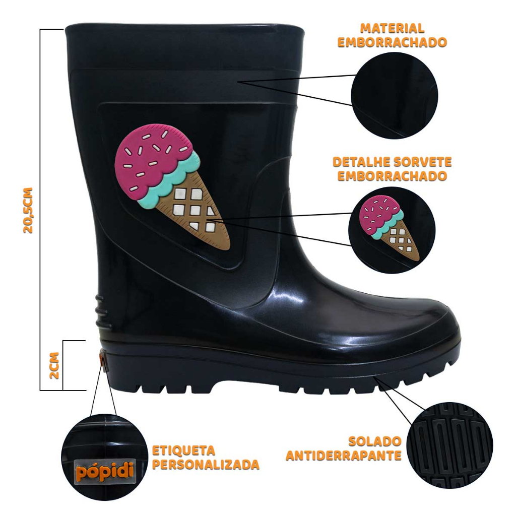 Galocha Infantil segue sendo tendência. É a escolha perfeita tanto para dias chuvosos, quanto dias ensolarados, reunindo o estilo e a praticidade em um só produto. DESCRIÇÃO Produto Injetado em PVC, extremamente confortável e palmilha em EVA dublada. Possui solado antiderrapante, dando maior segurança e aderência ao andar. DETALHES DO PRODUTO Material Externo: Injetado PVC Material Interno: Injetado PVC Material da Palmilha: EVA dublado Material da Sola: Injetado PVC Fechamento: Calce Fácil Embalagem: Não é entregue em caixa individual. Nós da Pópidi cuidamos com carinho da relação pré e pós-venda, afinal a satisfação de nossos clientes é muito importante para nós! Atendimento: Segunda à sexta: 07:00 às 18:00 Sábado: 09:00 às 13:00 TABELA DE MEDIDAS Número ---- Medida ------- Cano ----- Circunferência 25/26 ------ 16,8cm ------ 17,0cm ------ 26,5cm 27/28 ------ 18,0cm ------ 17,5cm ------ 28,5cm 29/30 ------ 19,4cm ------ 18,0cm ------ 30,0cm 31/32 ------- 21,0cm ------ 19,0cm ------ 32,0cm 33/34 ------ 22,3cm ------ 20,0cm ------ 34,0cm COMO MEDIR Coloque o pé em cima de uma folha de papel e risque em volta dele com um lápis ou caneta. Meça o comprimento do topo até a base do contorno e adicione 0,5 cm de folga. LIMPEZA E CONSERVAÇÃO Evite usar substâncias abrasivas como álcool, detergentes ou solventes nos calçados. Nunca os mergulhe na água, os deixe de molho ou lave na máquina. A secagem dos produtos deve ser feita à temperatura ambiente e na sombra, nunca no sol ou em máquinas. SOBRE A EMPRESA Visão Estar em constante expansão e inovação, de uma forma consistente e arrojada. Missão Proporcionar o bem estar dos nossos clientes, satisfazendo-os em um ambiente agradável e cortês com produtos a preços justos e de qualidade. Valores Respeito, Dedicação, Conexão e Atitude. Boas compras e volte sempre!!!