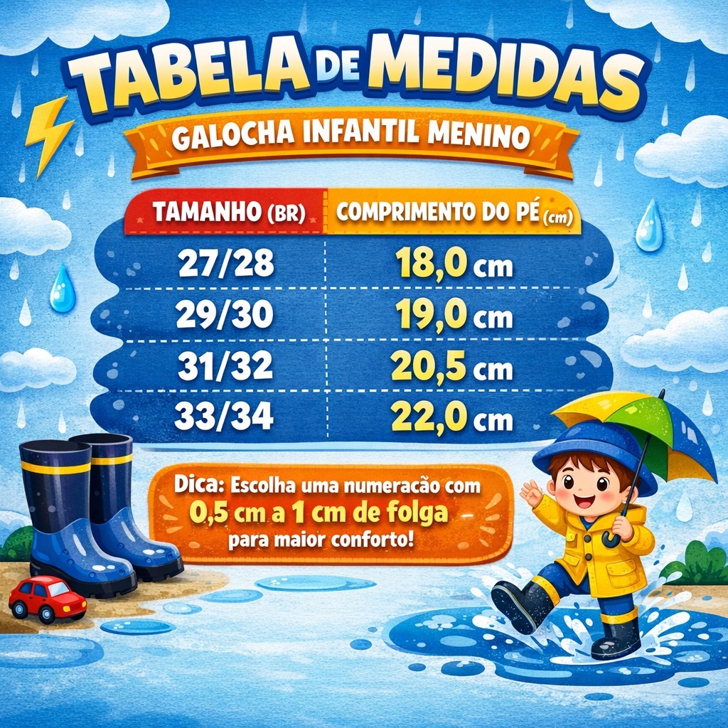 ✨ Deixe a imaginação do seu filho voar! ✨ Procurando o calçado perfeito que une o conforto que você deseja com a alegria que seu pequeno merece? Nossa galocha foi feito pensando em cada passo, cada corrida e cada aventura! Por que os papais, as mamães e os pequenos amam? * 👣 Leveza para Correr e Brincar! Feito com um material super leve, nossa galocha é a escolha ideal para que seu filho se sinta livre para explorar o mundo sem nada a atrapalhar. Perfeito para a energia inesgotável da infância! * 💙 Conforto que Acompanha! Seu design anatômico se encaixa perfeitamente nos pezinhos, evitando qualquer desconforto ou atrito. É como andar nas nuvens! * 🚀 Estilo e Diversão para Aventuras! Com um design moderno e cheio de personalidade, esta galocha é mais que um calçado: é o companheiro perfeito para cada brincadeira. Um toque de estilo para cada momento! 🎁 Dê o presente do conforto e da liberdade para o seu pequeno! Ele merece se sentir especial em cada passo. 📏 Tamanhos variados: Consulte a tabela de medidas e escolha o ideal para seu(a) pequeno(a)! 👉 Dica para os papais e mamães: Meçam a palmilha de um calçado que já serve no seu filho e comparem com nossa tabela para o ajuste perfeito! 🥰
