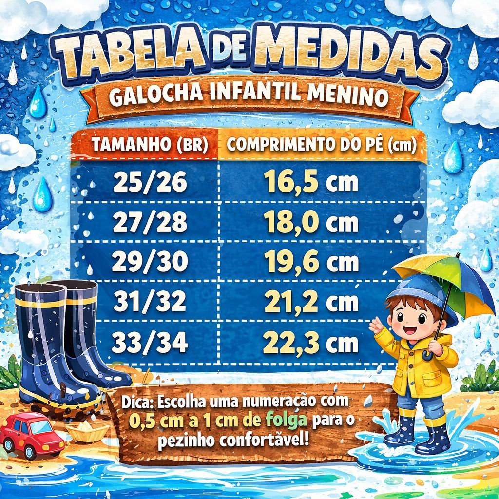 ✨ Deixe a imaginação do seu filho voar! ✨ Procurando o calçado perfeito que une o conforto que você deseja com a alegria que seu pequeno merece? Nossa galocha foi feito pensando em cada passo, cada corrida e cada aventura! Por que os papais, as mamães e os pequenos amam? * 👣 Leveza para Correr e Brincar! Feito com um material super leve, nossa galocha é a escolha ideal para que seu filho se sinta livre para explorar o mundo sem nada a atrapalhar. Perfeito para a energia inesgotável da infância! * 💙 Conforto que Acompanha! Seu design anatômico se encaixa perfeitamente nos pezinhos, evitando qualquer desconforto ou atrito. É como andar nas nuvens! * 🚀 Estilo e Diversão para Aventuras! Com um design moderno e cheio de personalidade, esta galocha é mais que um calçado: é o companheiro perfeito para cada brincadeira. Um toque de estilo para cada momento! 🎁 Dê o presente do conforto e da liberdade para o seu pequeno! Ele merece se sentir especial em cada passo. 📏 Tamanhos variados: Consulte a tabela de medidas e escolha o ideal para seu(a) pequeno(a)! 👉 Dica para os papais e mamães: Meçam a palmilha de um calçado que já serve no seu filho e comparem com nossa tabela para o ajuste perfeito! 🥰