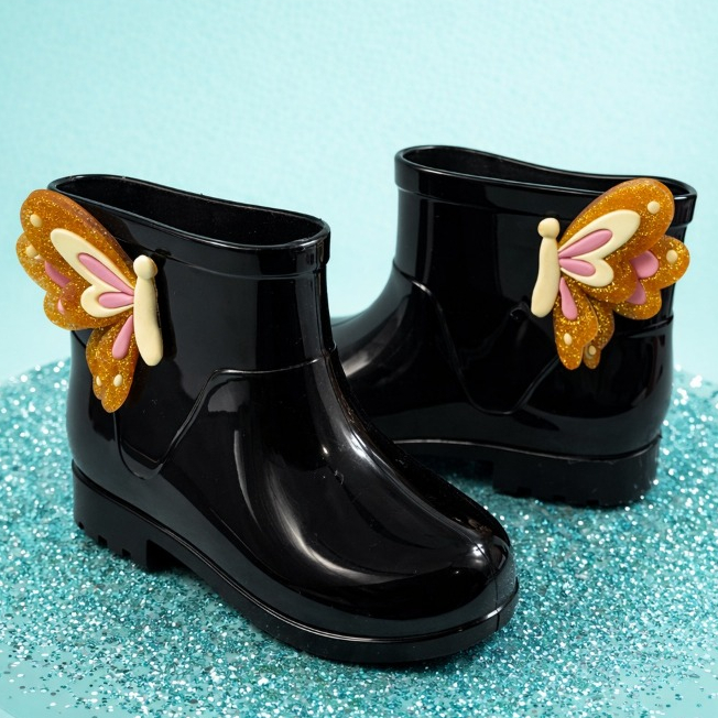Galocha Infantil Menina Glitter Brilhante com Borboleta Dourada – Bota de Chuva Impermeável Antiderrapante