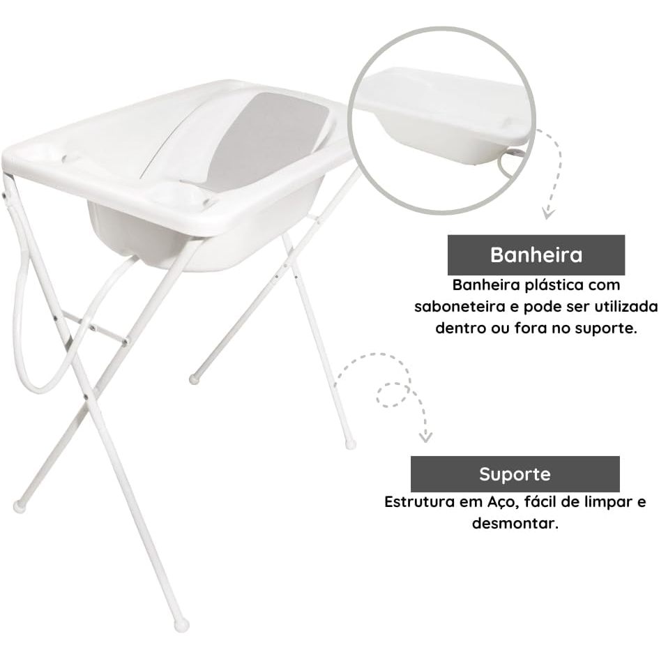 Banheira 2 em 1 – o tanque pode ser utilizado no suporte ou fora;Capacidade máxima da banheira (Bebê + Água) = 20 kg;Banheira bebê plástica com saboneteira;Mangueira para saída de água do tanque;Redutor da banheira