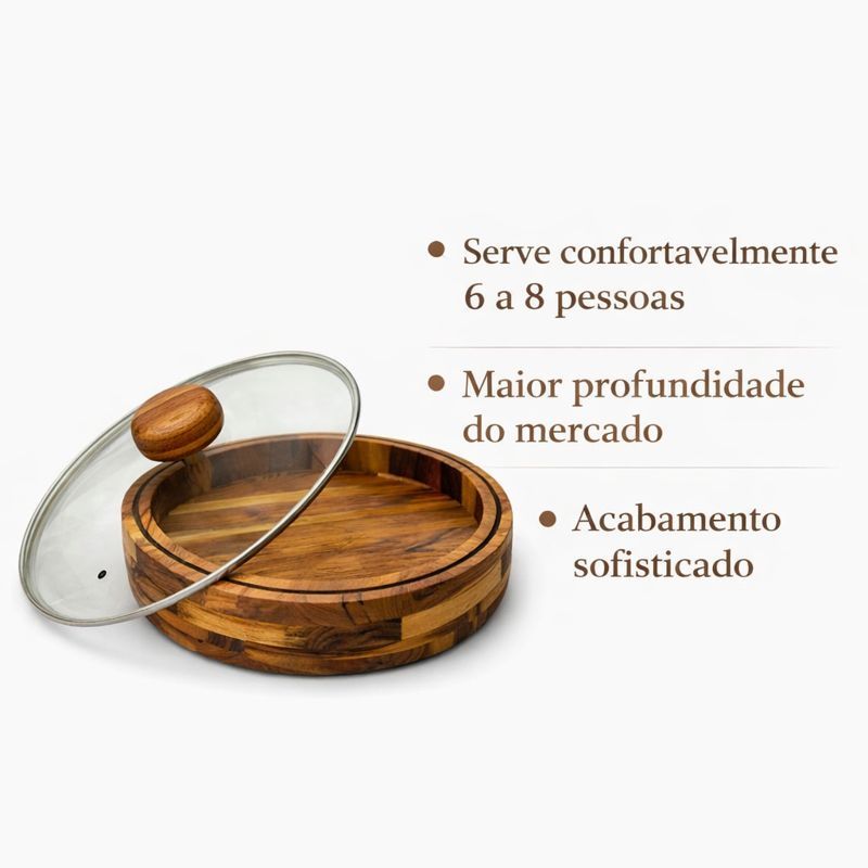 Gamela de Madeira 34cm com Tampa de Vidro Ideal para Churrasco e Servir