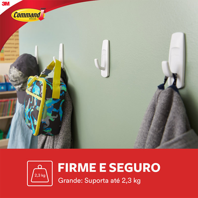Gancho adesivo Command branco grande H0001818105 - 3M Decora e organiza a sua casa de forma prática, não estraga as paredes, servindo para pendurar sem furar. Não deixa resíduos. Gancho para pendurar fácil e rápido de aplicar. O gancho adesivo 3M Command transparente é a solução ideal para organizar e decorar sua casa, dando destaque apenas ao que estiver pendurado. Faça você mesmo em minutos de forma prática, sem sujeira, sem furos e remova quando quiser, sem estragar sua parede. Detalhes: - Firme e seguro: Cada gancho suporta até 2,3 kg - Sem ferramentas: Fácil de aplicar e remover - Remoção limpa: Não deixa adesivo nem danifica a parede - Gancho: Poliestireno de alto impacto - Tira adesiva: Fita de polietileno com adesivo à base de borracha.