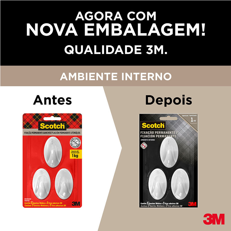 Gancho adesivo Scotch branco médio 3 unid HB004684294 - 3M Ideal para organizar e pendurar diversos objetos, design moderno e diferenciado. Não precisa de pregos ou parafusos e possui fixação permanente. O gancho adesivo 3M Scotch é indicado para fixação permanente em para ambientes internos. Detalhes: - Sua instalação é fácil, sem ferramentas, sem pregos e sem parafusos e suporta até 1 kg - Poliestireno e adesivo à base de borracha sintética liner protetor